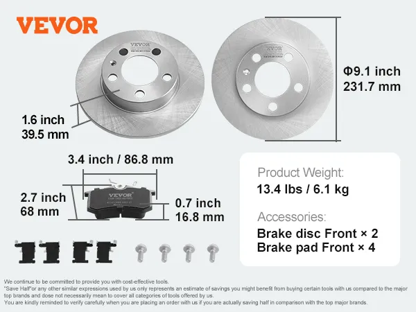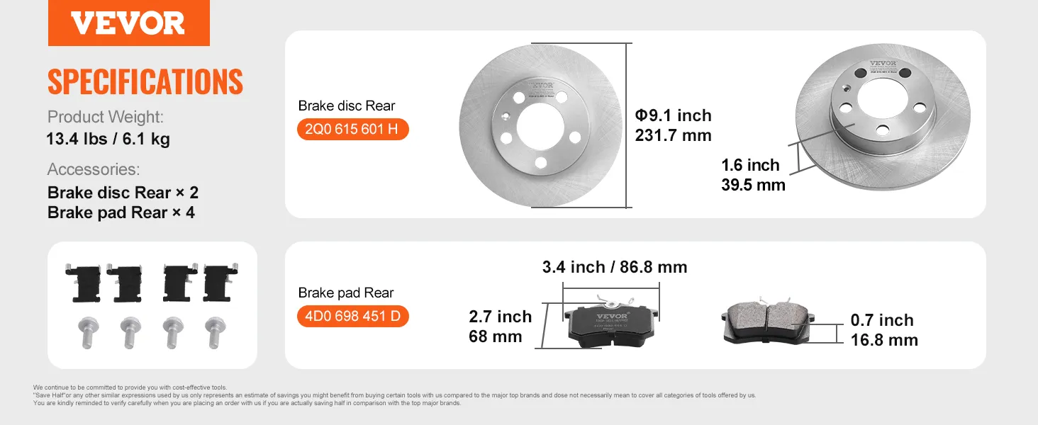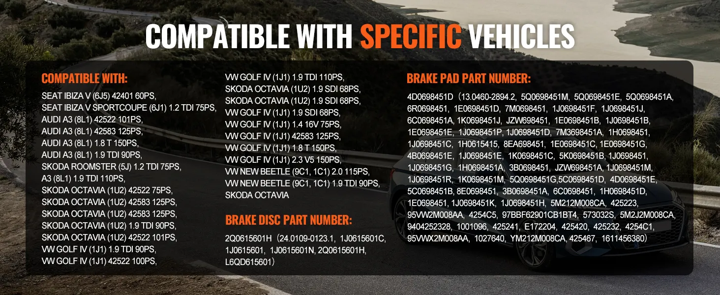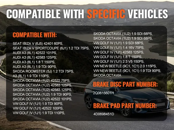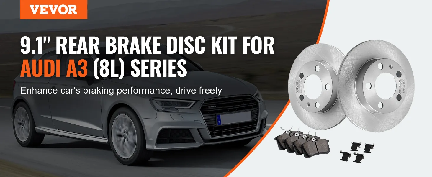 Vehicle Compatibility: Compatible with a range of models, this comprehensive rear brake replacement kit includes 2 rear brake rotors and 4 rear brake pads. The brake rotor diameter is 9.1"/232 mm, specifically for AUDI A3(8L), SEAT IBIZA, SKODA OCTAVIA, ROOMSTER, VW GOLF Ⅳ, and more.