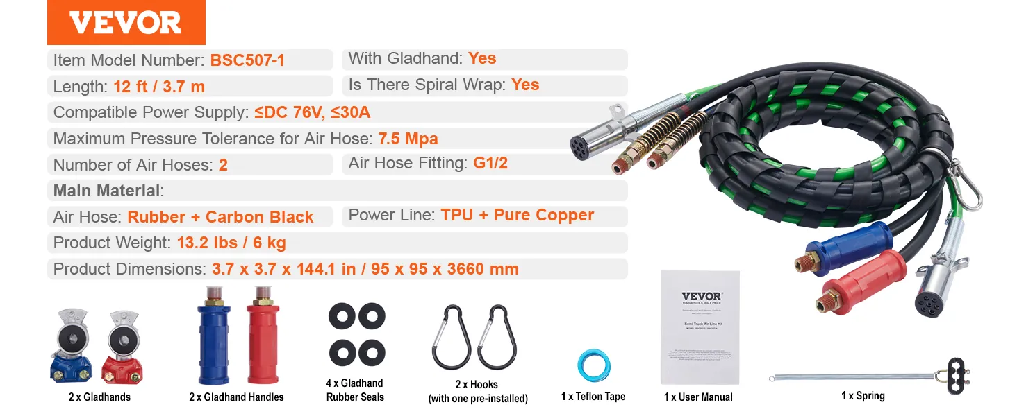 12FT Semi Truck Air Lines Kit with Glad Hands: VEVOR 3-in-1 semi truck air lines kit is perfect for replacing your old, severely worn-out, and tangled standard ABS air power lines. It includes a comprehensive set: 2 glad hands, 2 gladhand handles, 2 hooks (one pre-installed), 1 spring, 4 gladhand seals, and 1 teflon tape. 12 ft length is compatible with small truck models such as Philips 30-2151, 302171; Tectran 169157, 13S15401; and OTR 6818, 6814.