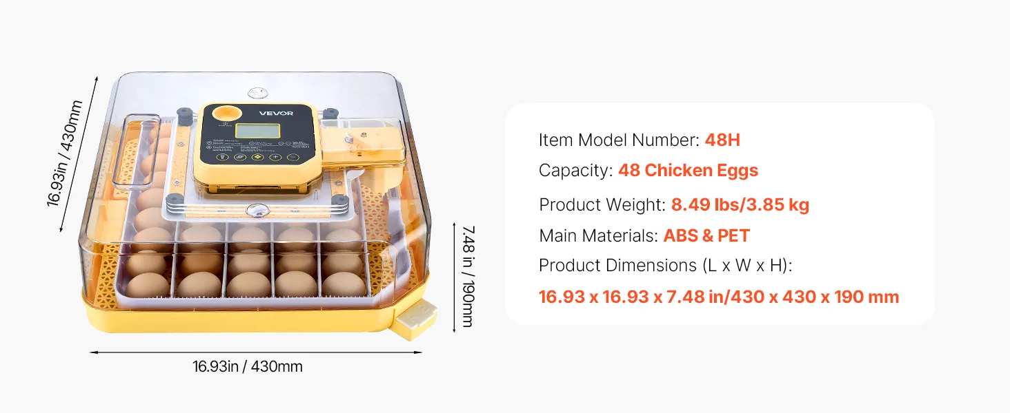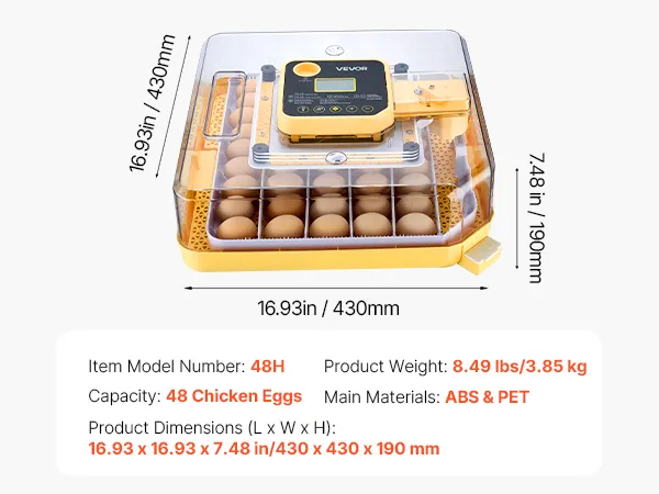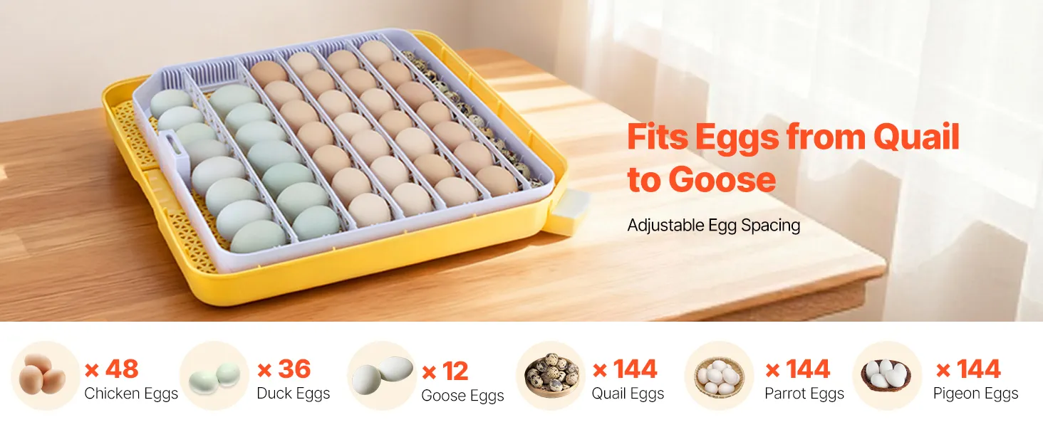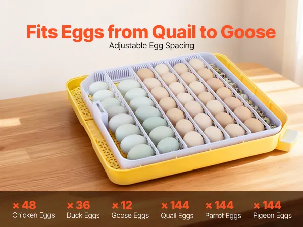 Verstelbare eierafstand: Onze broedmachine is geschikt voor verschillende soorten eieren en biedt plaats aan maximaal 48 kippeneieren, 36 eendeneieren, 12 ganzeneieren of 144 kleinere eieren, zoals kwarteleieren.