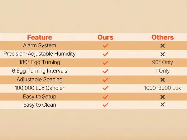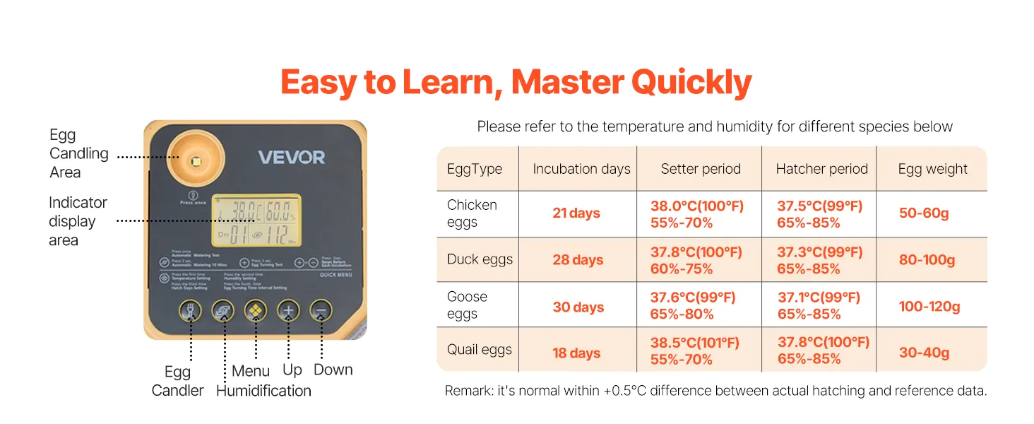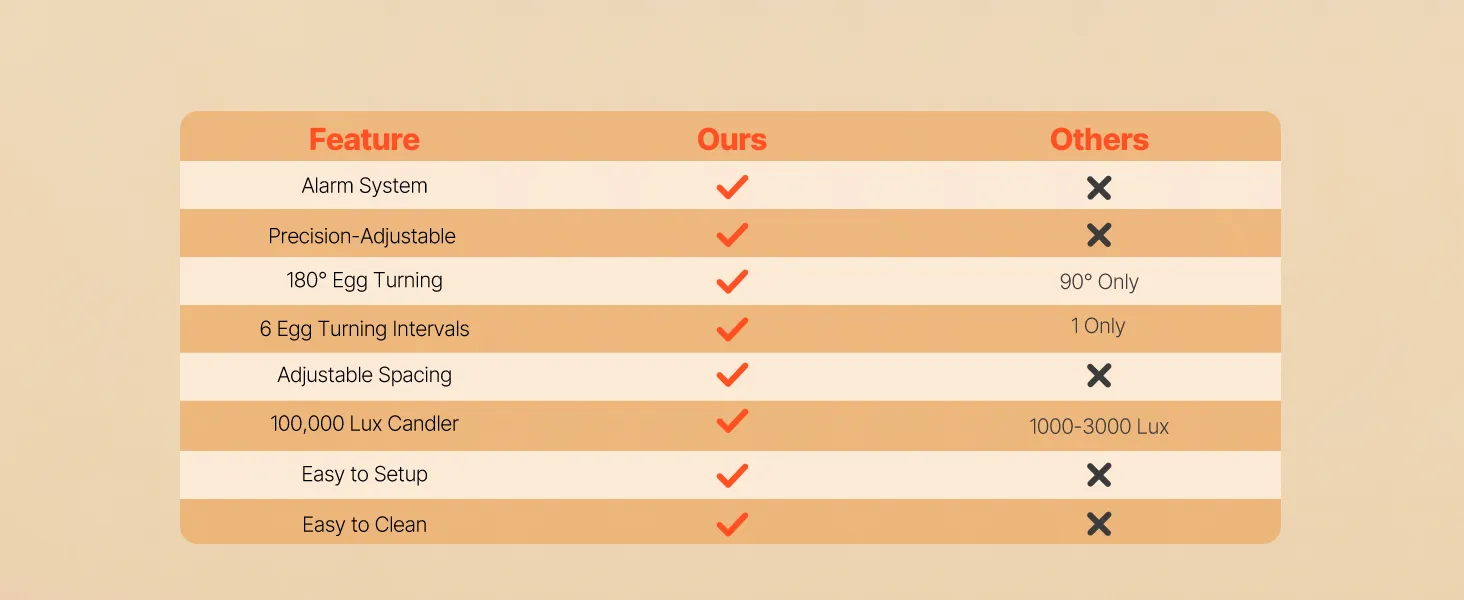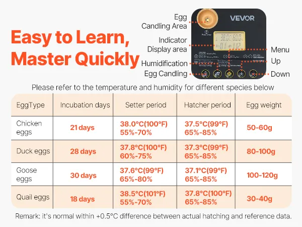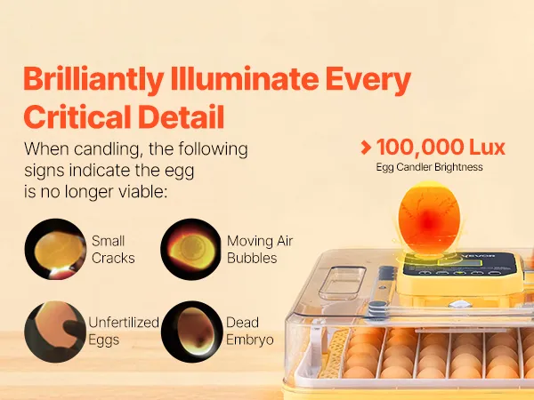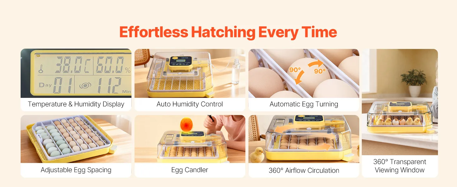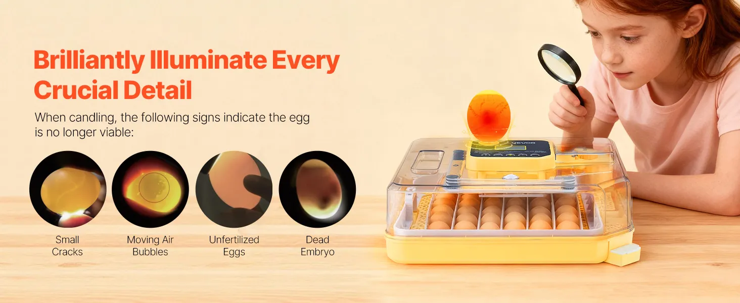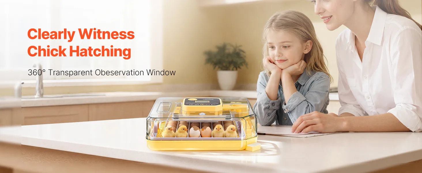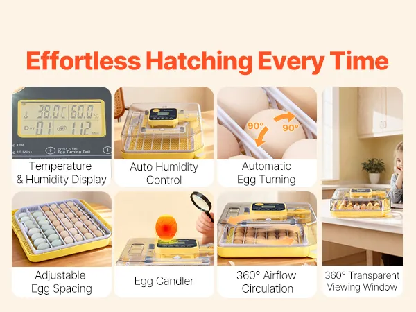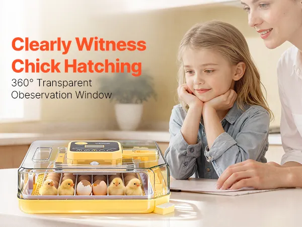 Eiertestapparaat & 360° kijkvenster: Onze automatische eierkeerder is uitgerust met een helder 10W lux eiertestapparaat voor eenvoudige inspectie van de embryo's. Dankzij het transparante 360° kijkvenster kan het hele gezin het uitkomen van de kuikens volgen.