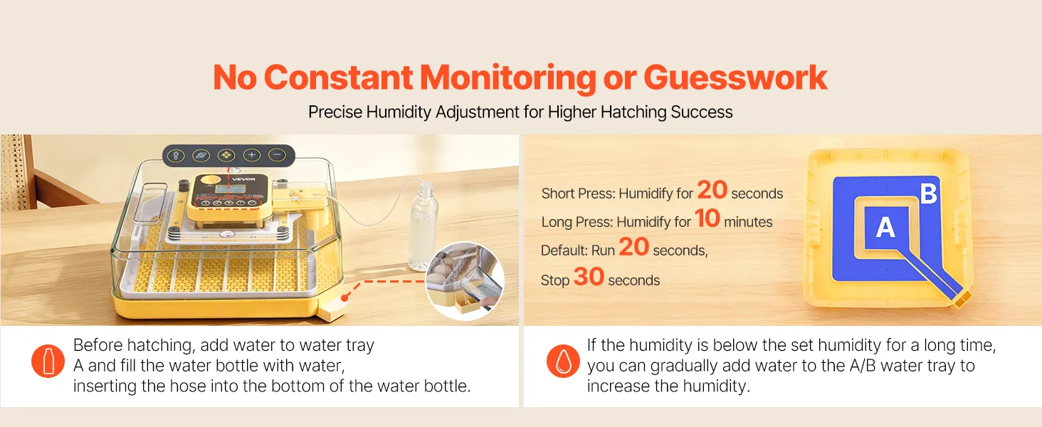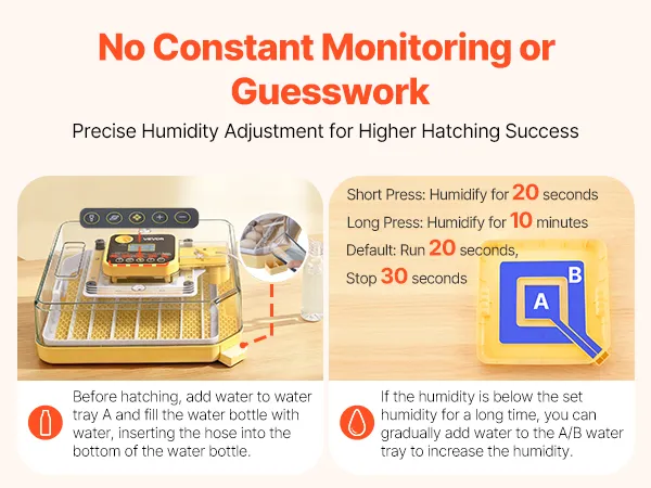 Automatische vochtigheidsregeling: Onze eierbroedmachine handhaaft een constante luchtvochtigheid door automatisch water uit een fles via een slangetje aan te zuigen en dit naar behoefte in de broedkamer te druppelen. Dit maakt het broeden moeiteloos – geen constante controle of giswerk nodig.