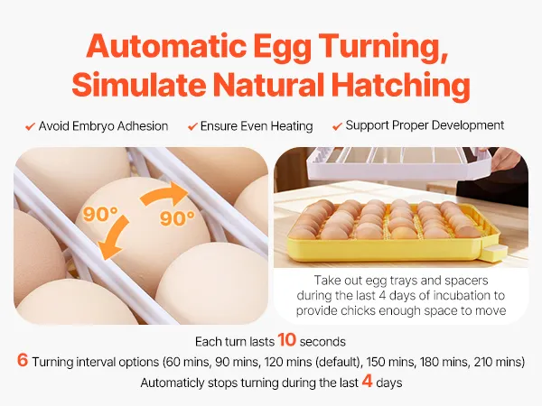 Automatisch 180° draaien van de eieren (enkele rotatie): Deze broedmachine bootst het attente broedgedrag van een broedende hen na en draait de eieren automatisch met tussenpozen van zes instelbare intervallen van elk 10 seconden. Dit voorkomt dat het embryo aan elkaar plakt en zorgt voor een gelijkmatige verwarming.