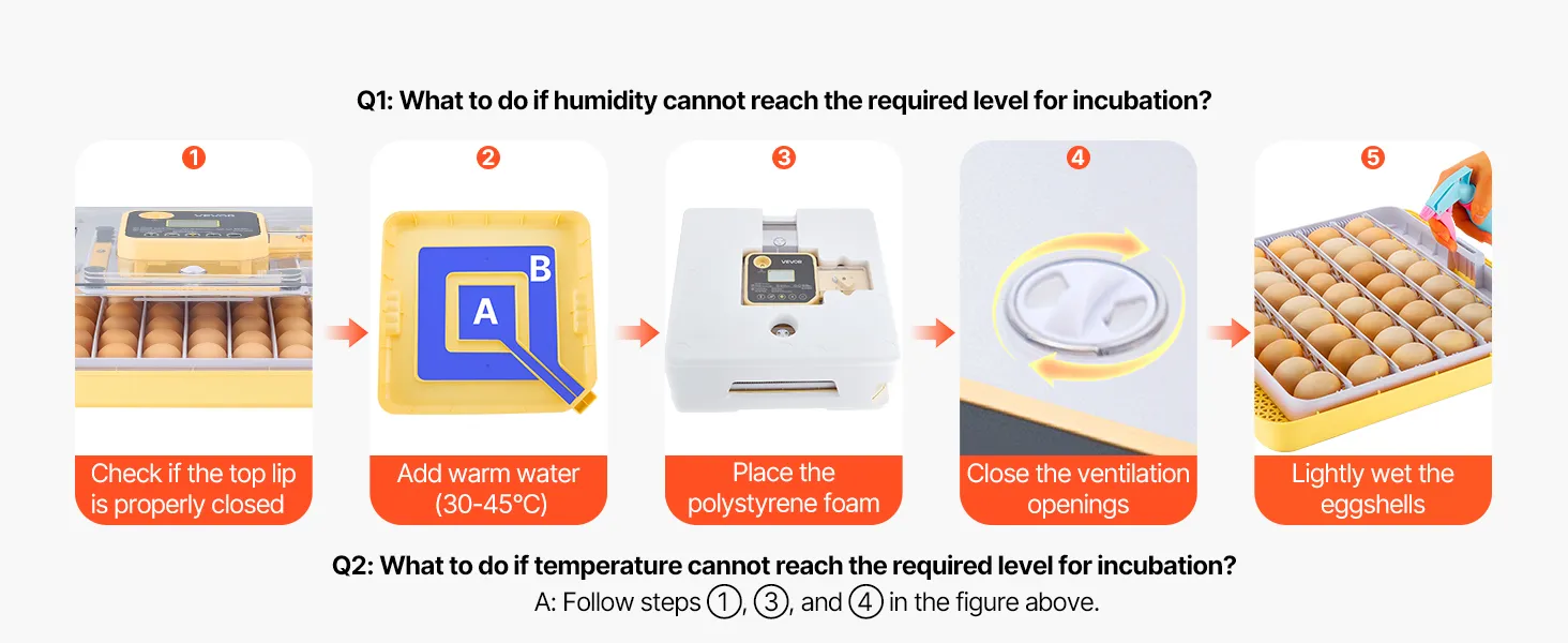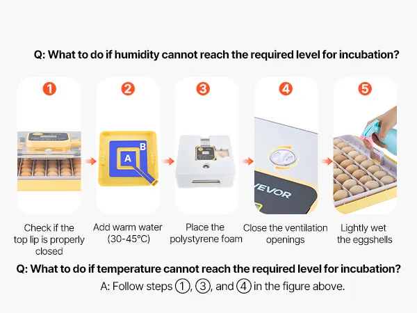 Vraag 2: Welke voorzorgsmaatregelen moeten worden genomen tijdens het uitkomen van de eieren? A2: 1. Plaats het apparaat in schuim als de omgevingstemperatuur onder de 20 °C/68 °F komt. 2. Open het deksel niet te vaak tijdens het broeden, anders drogen de intacte eierschalen uit en worden ze moeilijk te breken. Vraag 3: Welke voorzorgsmaatregelen moet men nemen bij het schouwen van eieren? A3: 1. Vermijd bij het schouwen van de eieren overmatige trillingen of rotatie, aangezien dit kan leiden tot de dood van het embryo door stress. 2. Omdat de kamertemperatuur lager is, moet het schouwen van de eieren zo snel mogelijk worden uitgevoerd.
