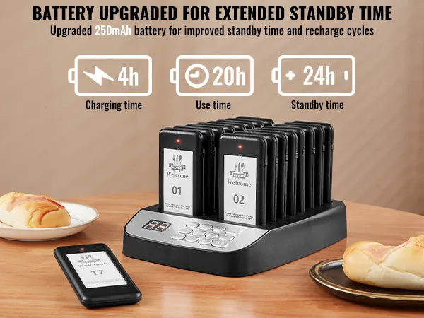 Pagers zijn uitgerust met een nieuw verbeterde 250mAh lithium-polymeerbatterij, die de standby-tijd en oplaadcycli verbetert en geschikt is voor een dag werken.