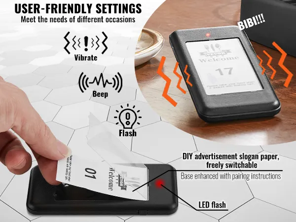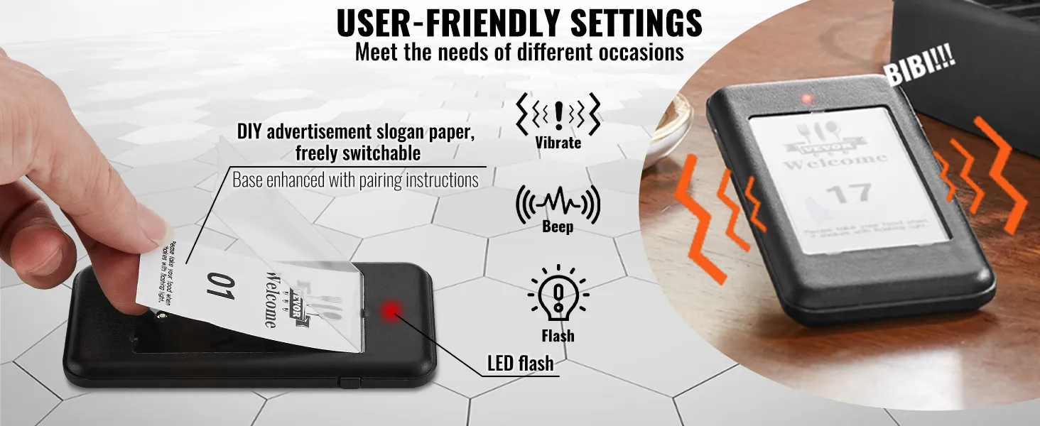 De pager heeft LED-, trilmotor- en zoemeralarmmodi. Zelfs in een luidruchtig restaurant kunnen gasten de piep horen. Dankzij de uitsparing voor zelfbedrukt reclamepapier is het wisselen eenvoudig.