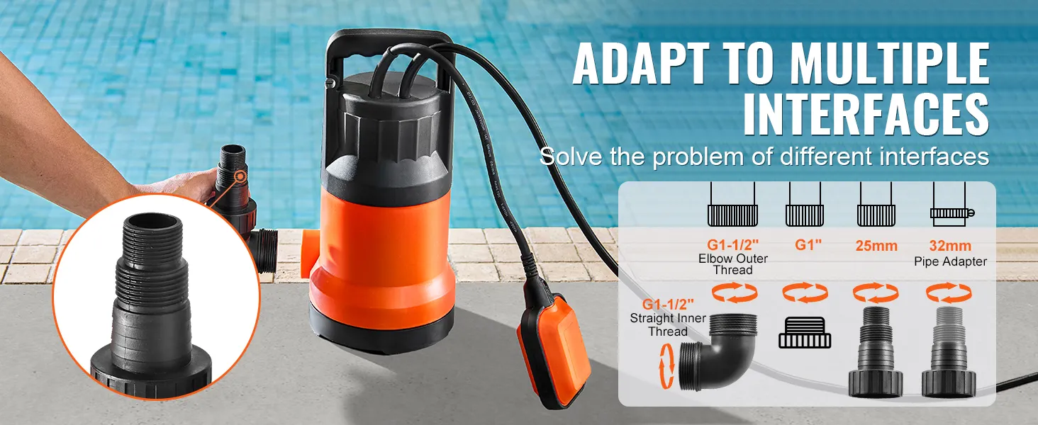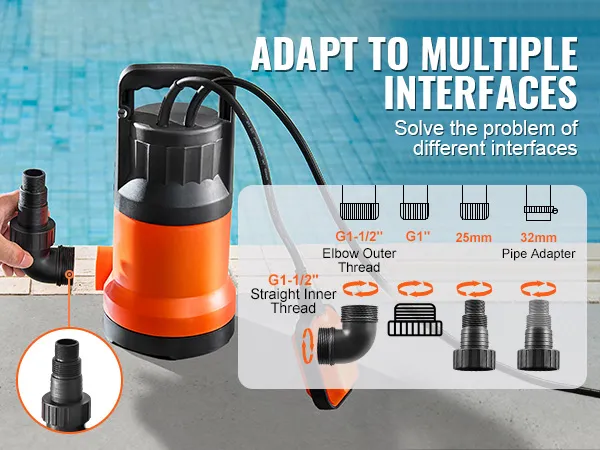 Excellent Compatibility: Our submersible utility pump comes with the G1-1/2" elbow outer thread, G1-1/2" straight inner thread, G1", 25 mm, and 32 mm pipe adapter, making it a breeze to use in any situation. The practical adapter design enables you to easily address various water treatment issues in your yard, enhancing versatility and convenience.