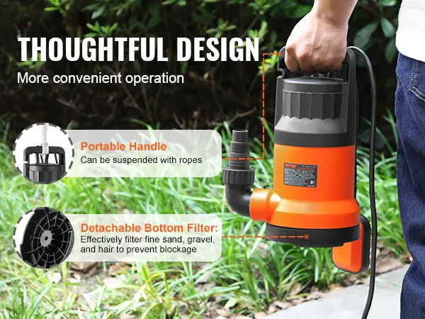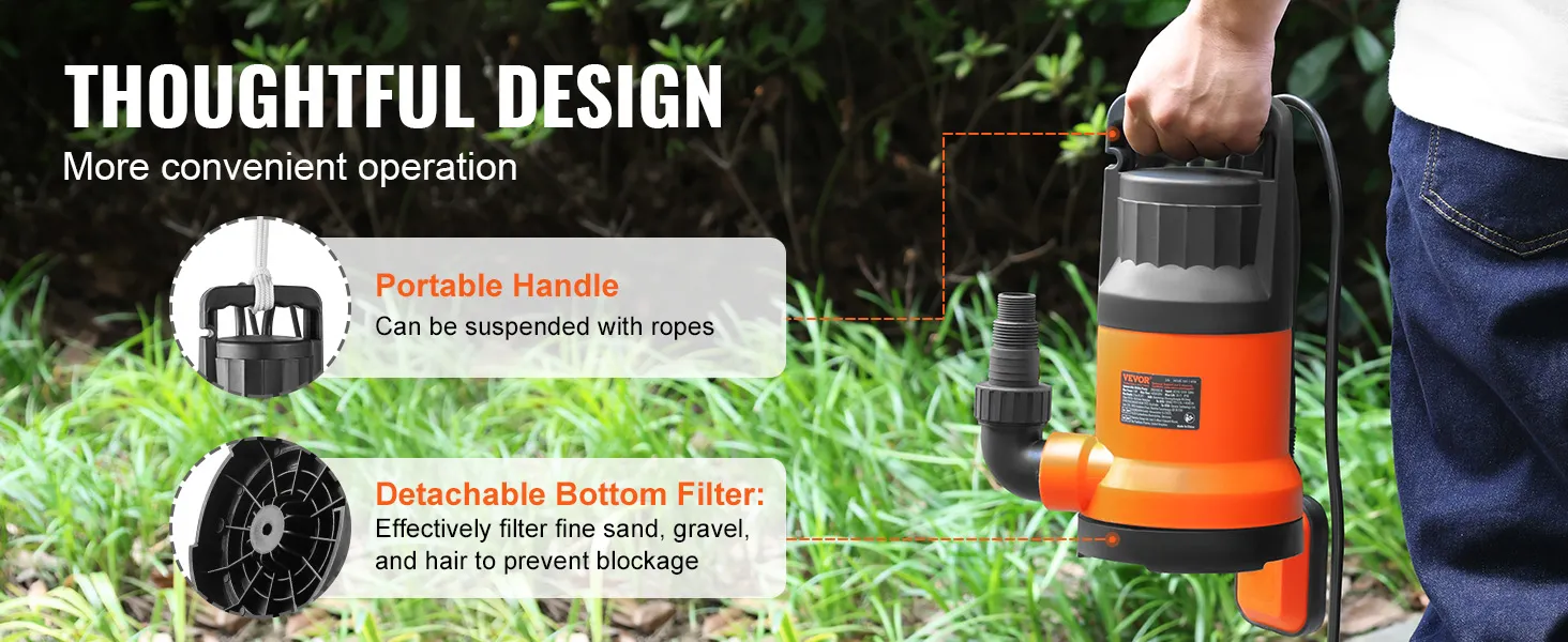 User-Friendly Design: We've thought of everything to make your life easier. With a 10 ft long power cord, bottom detachable filter, and handy carrying handle, operating and maintaining our sump pump is a breeze. Pumping water has never been this convenient!