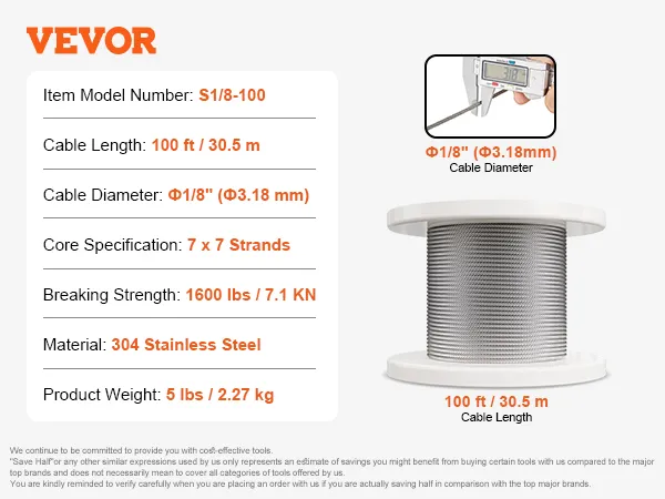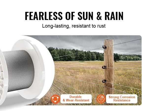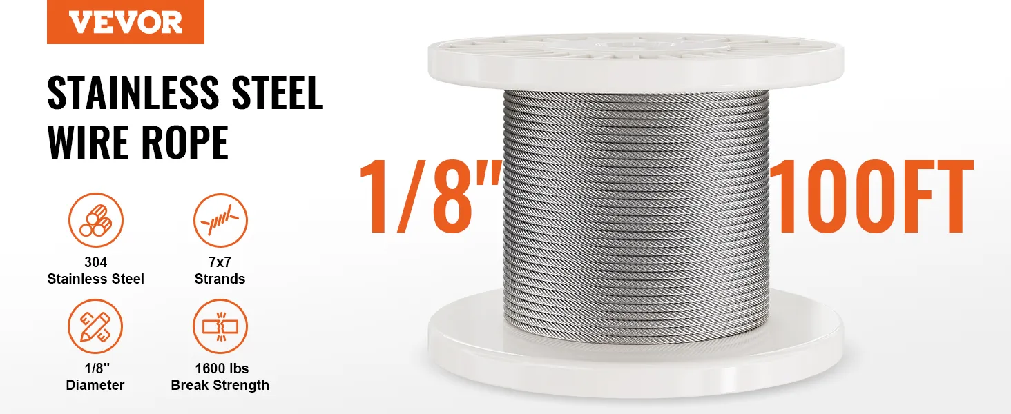 Roest- en corrosiebestendigheid: onze 100ft (30,5 m) staalkabel is gemaakt van hoogwaardig T304 roestvrij staal met toegevoegd molybdeen, dat een betere breeksterkte en oxidatieweerstand heeft. Het is ideaal voor buiteninstallaties waar robuuste kwaliteit en een langere levensduur vereist zijn.