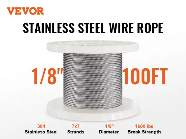 Robuust en flexibel: 1/8 inch (3,18 mm) roestvrijstalen kabel gebouwd op de 7x7 gevlochten constructie. Vergeleken met andere kernontwerpen balanceert 7x7 zowel de kabelflexibiliteit als het draagvermogen. De staalkabel is goed te buigen of te vouwen bij het decoreren van uw tuinschutting.