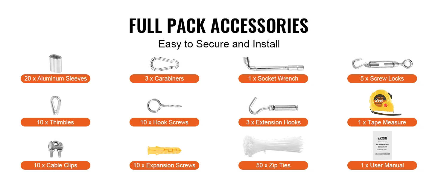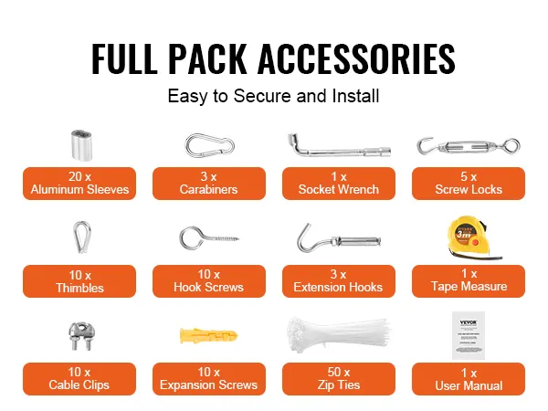 Eenvoudig te installeren en te gebruiken: onze vliegtuigkabel wordt geleverd met 20 x aluminium hulzen, 10 x vingerhoeden, 10 x haakschroeven, 3 x karabijnhaken, 3 x verlenghaken, 5 x schroefdoppen, 10 x kabelclips, 1 x dopsleutel, 1 x meetlint, 10 x expansieschroeven, 50 x kabelbinders en 1 x gebruikershandleiding - alles wat u nodig heeft voor een eenvoudige installatie.