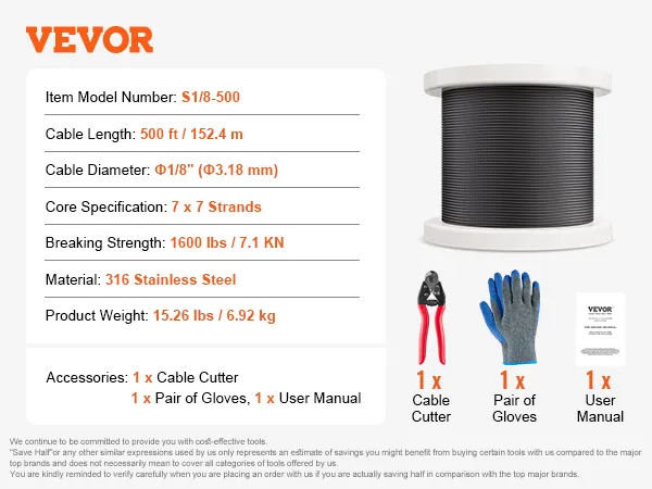 VEVOR Wire Rope Kit, 1/8" 500 ft 316 Stainless Steel Cable with Cutter and Gloves, 1600 lbs Breaking Strength, 7x7 Strands Core Marine Aircraft Grade for Handrail Stair Decking Fence Outdoors, Black VEVOR Wire Rope Kit, 1/8" 500 ft 316 Stainless Steel Cable with Cutter and Gloves, 1600 lbs Breaking Strength, 7x7 Strands Core Marine Aircraft Grade for Handrail Stair Decking Fence Outdoors, Black