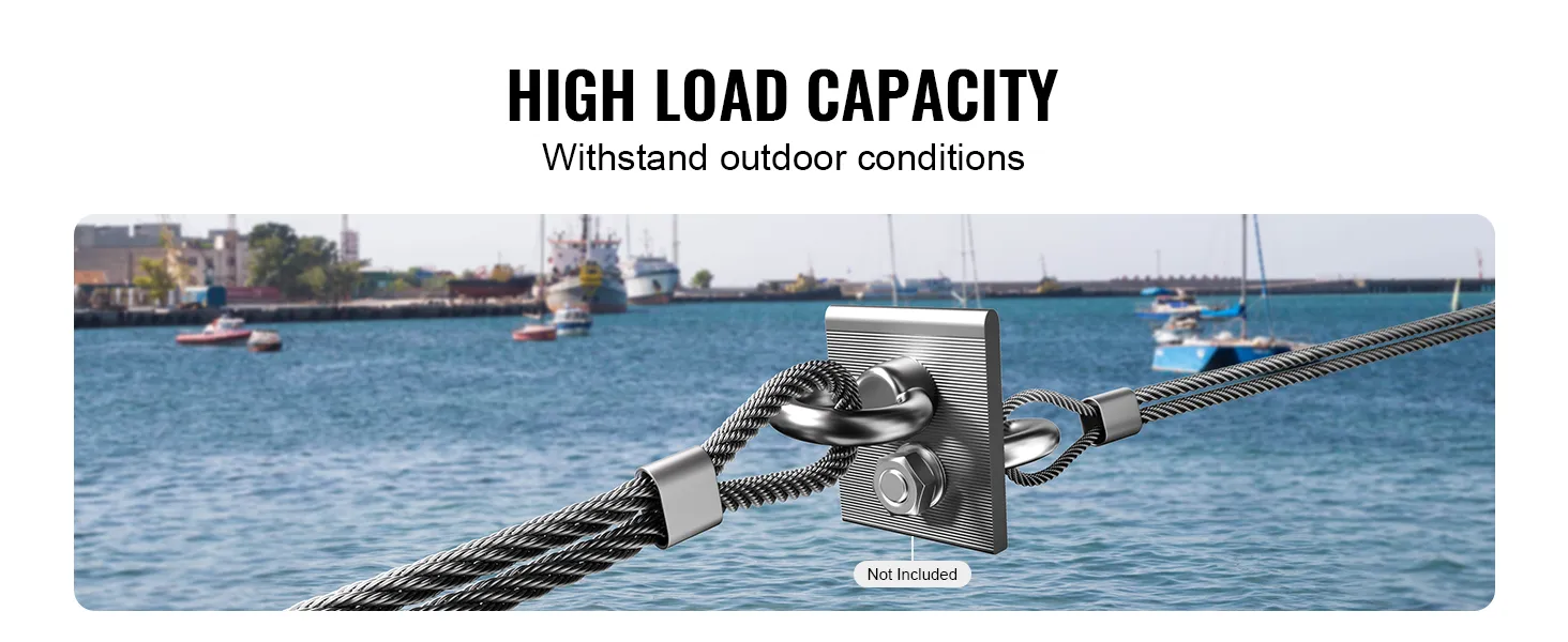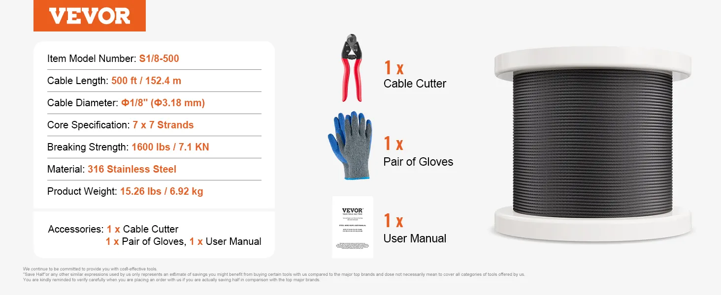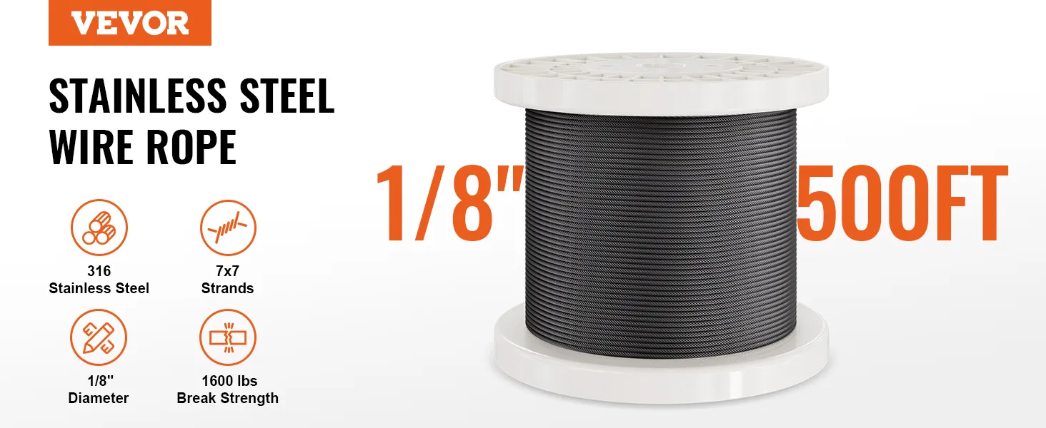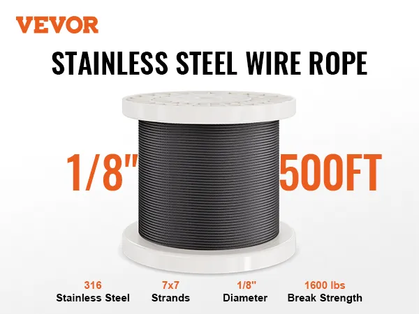 • Rust and Corrosion Resistance: VEVOR 500 ft (152.4 m) steel cable is made of premium T316 stainless steel with added molybdenum that comes with a better performance on its breaking strength and anti-oxidation. It is great for outdoor installation that requires a tough quality and longer lifespan.