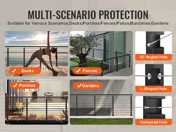 Versatile Protection: Our cable railing posts are suitable for both indoor and outdoor protection applications, such as decks, porches, fences, patios, balconies, gardens, residential buildings, commercial offices, hotels, garages, and more.