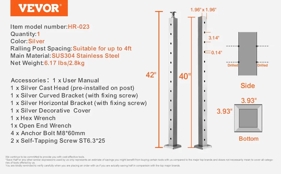 De VEVOR leuningpalen bieden optimale ondersteuning en stabiliteit. Deze palen bieden optimaal comfort en veiligheid. Ze zijn ontworpen om alle gebruikers een veilige grip te bieden. Het elegante ontwerp voegt verfijning toe aan elke ruimte. Ze zijn gemaakt van hoogwaardig roestvrij staal en zijn gebouwd om lang mee te gaan. De palen zijn eenvoudig te installeren en te onderhouden. Alle benodigde bevestigingsmaterialen zijn inbegrepen. Het maakt niet uit of u ze op hout of beton installeert, het proces verloopt vlekkeloos. Deze paal is een perfecte mix van functionaliteit en stijl. U kunt hem overal gebruiken.