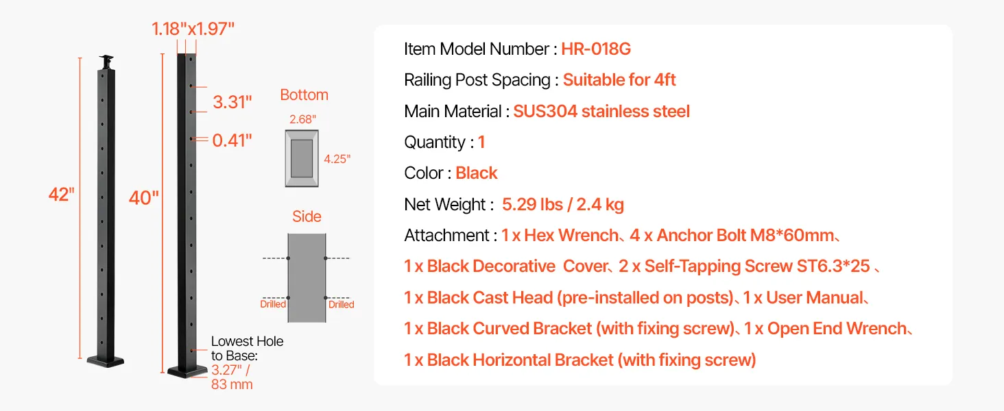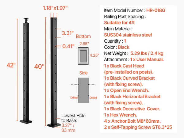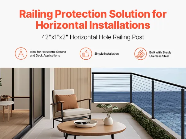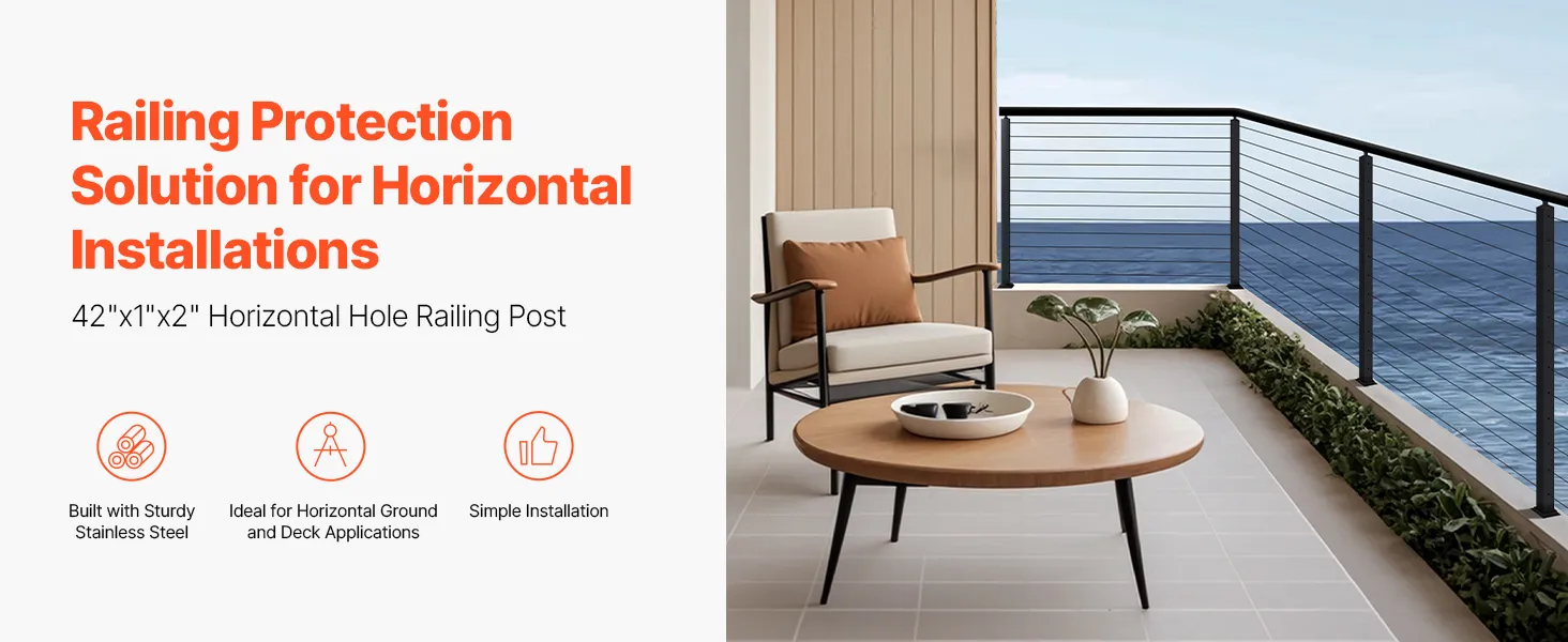 Horizontal Hole Railing Post: This horizontal hole cable railing post is available in 42" and 36" heights, with 0.31" and 0.41" holes, totaling 10-12 holes. It is designed for horizontal ground/deck railing protection, safeguarding you and your family. Note: This product does not include wire ropes