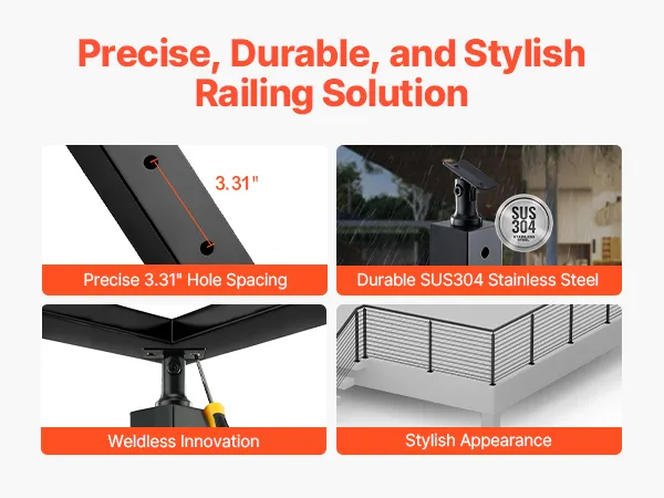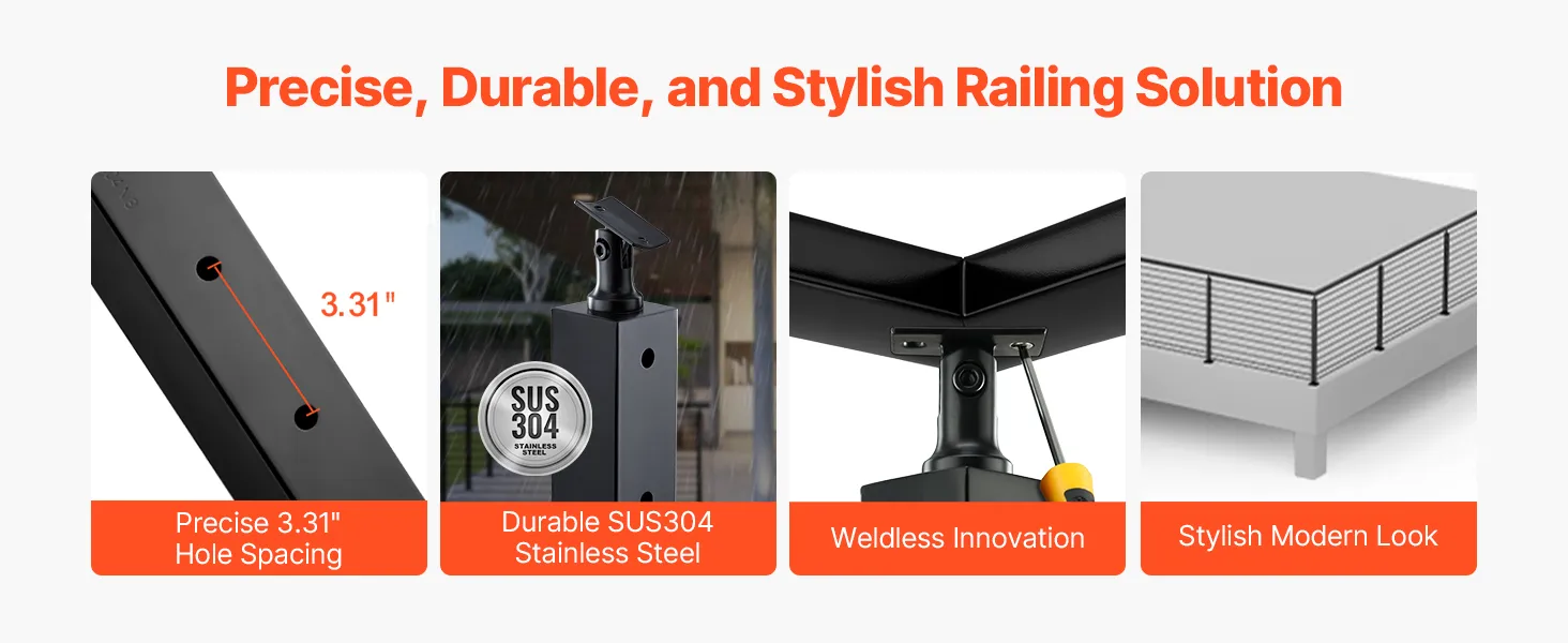 Our cable railing system is made from high-quality SUS304 stainless steel, featuring 3" hole spacing that complies with building codes. It is non-welded with a black finish, making it stylish and versatile for various settings.