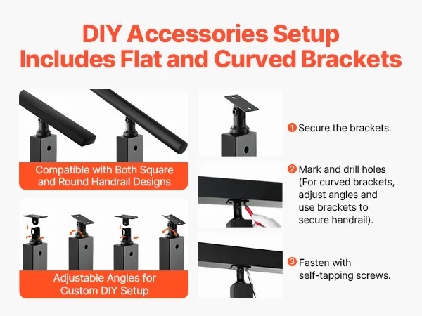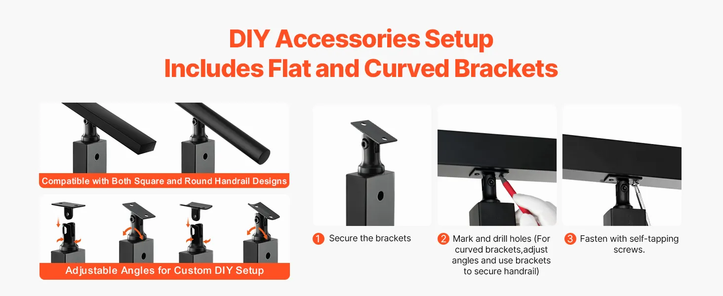 Easy Installation and DIY: This deck railing post includes horizontal and curved supports, suitable for various hole types in railing posts. It is compatible with square and round pipe handrails, allowing for DIY customization of handrail angles