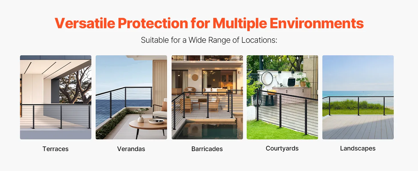 This deck railing kit is suitable for both indoor and outdoor protective applications, such as decks, stairs, porches, fences, patios, balconies, gardens, residential buildings, commercial offices, hotels, garages, and more.