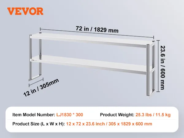 De VEVOR double over shelf is perfect voor keukens van alle formaten. Het biedt de ideale hoogte en lengte voor efficiënt werk. Het ontwerp met twee lagen helpt de opslag en werkruimte te maximaliseren. Het ontwerp van de tafel maakt het gemakkelijk om items op beide niveaus op te bergen. Ook is de onderste plank geschikt voor het opbergen van zware items. Dit maakt het gemakkelijker om essentiële items te bereiken tijdens het werken. Deze tafel is veelzijdig en geschikt voor verschillende keukentaken. Niemand heeft meer ruimte nodig. Met deze dubbele overshek zal uw keuken echter georganiseerd en efficiënt zijn.