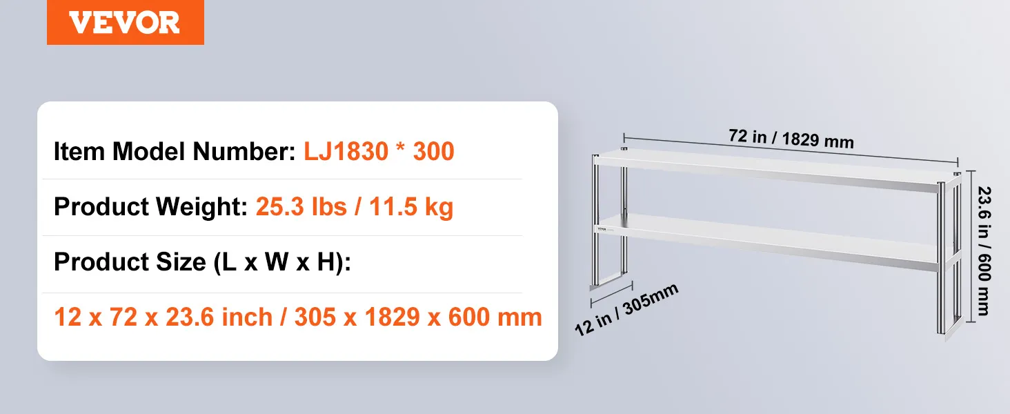VEVOR Dubbele bovenkast, bovenkast met dubbele bovenlaag van roestvrij staal, 305 x 1829 mm, bovenkast met dubbele bovenlaag, in hoogte verstelbare bovenkast, voorbereidingstafel voor keuken, restaurant en werkplaats