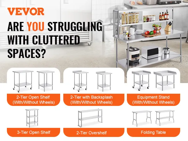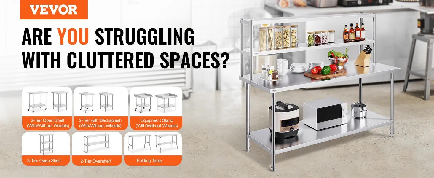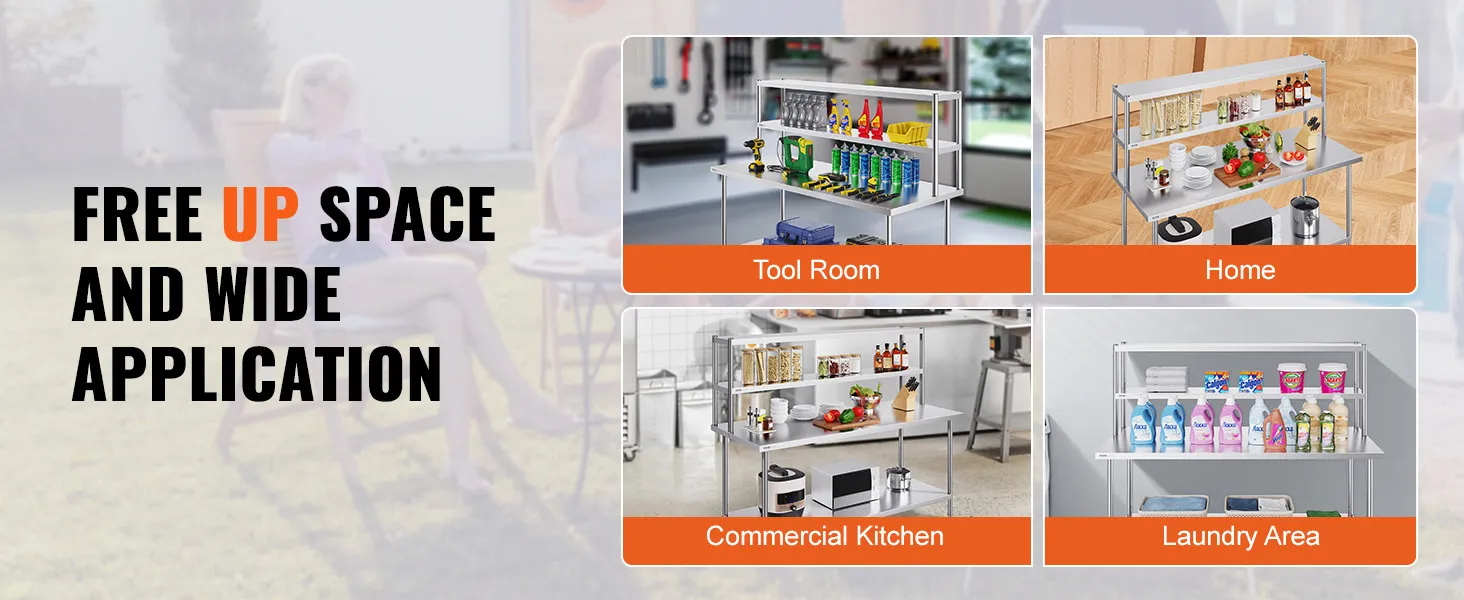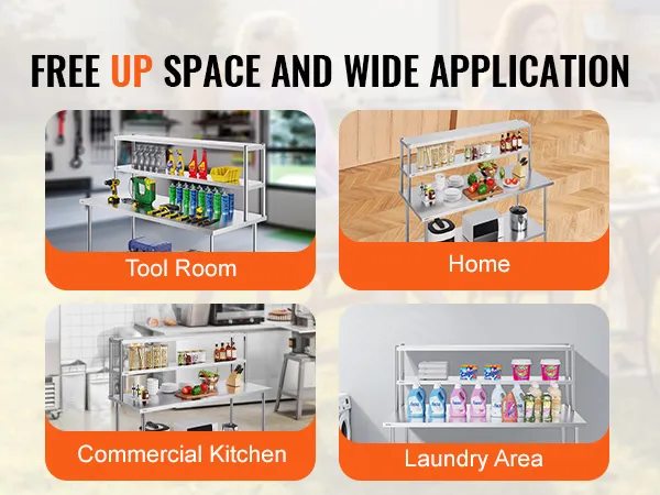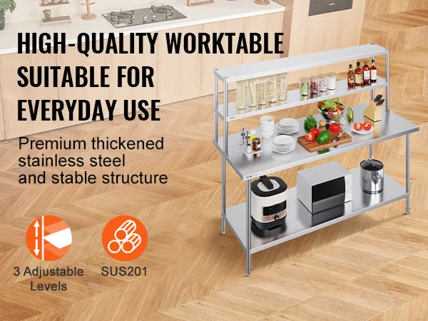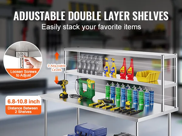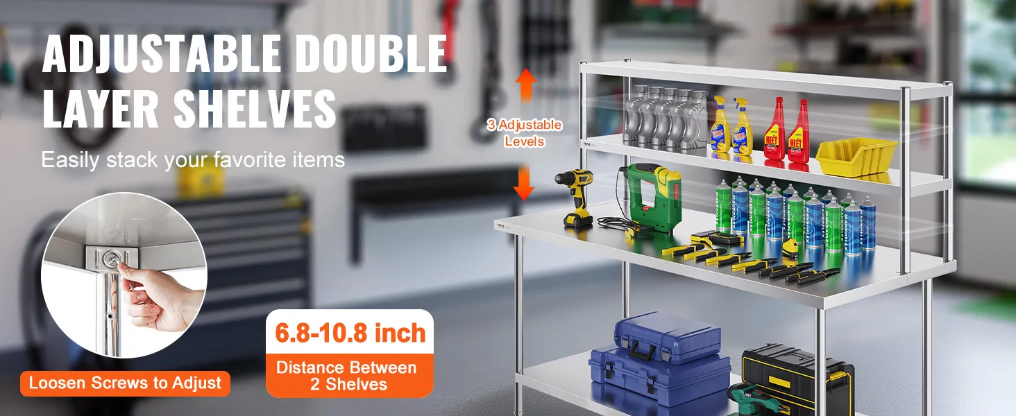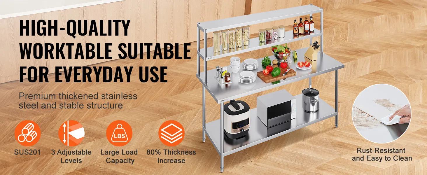 De VEVOR dubbele overplank biedt verbeterde opslag met zijn dubbeldeksontwerp. De onderste plank biedt extra ruimte voor het opbergen van spullen. U kunt uw keukenbenodigdheden binnen handbereik houden. Dit maakt het gemakkelijker om te vinden wat u nodig hebt tijdens het koken. Bovendien helpt het dubbeldeksontwerp om uw werkruimte te maximaliseren. U kunt het bovenste dek gebruiken voor het bereiden van voedsel en het onderste dek voor opslag. Het maakt de tafel nog functioneler. Bovendien helpt deze verbeterde opslag om de keuken georganiseerd te houden. U kunt spullen netjes en efficiënt opbergen, zodat uw keuken opgeruimd en rommelvrij blijft.