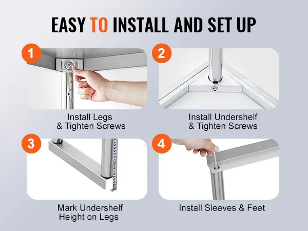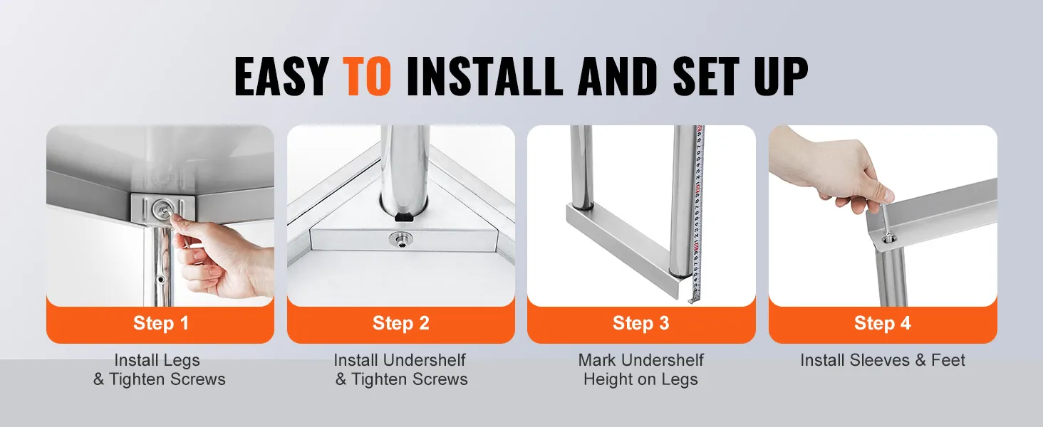 De VEVOR dubbele overplank is eenvoudig te monteren. U hebt geen speciaal gereedschap of vaardigheden nodig. Het proces is snel en eenvoudig. Het duurt slechts een paar minuten om de tafel op te zetten. Ook vergt het niet veel onderhoud. Deze tafel vereist ook heel weinig onderhoud. Ons roestvrijstalen materiaal is supergemakkelijk schoon te maken. Veeg het af met een droge doek. Dit zorgt ervoor dat het schoon en hygiënisch blijft. Het ontwerp van de tafel maakt het ook gemakkelijk om te verplaatsen. U kunt het dus zonder veel moeite verplaatsen als dat nodig is. Daarom zijn ze perfect voor zowel thuisgebruik als commercieel gebruik.