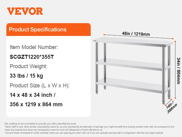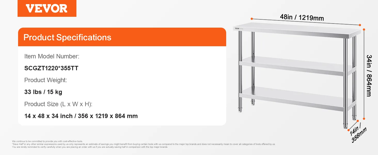 VEVOR Stainless Steel Food Prep Table, 14 x 48 x 34 Inch Commercial Kitchen Worktable, with 2 Adjustable Undershelf, Heavy Duty Prep Table Metal Work Table for BBQ, Kitchen, Home, and Garage