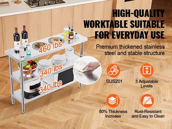High-Quality Stainless Steel: This work table, measuring 14 x 48 x 34 inch, is made from SUS201 stainless steel for the tabletop, shelves, and legs. It offers superior rust resistance, a sleek appearance, and a smooth surface that is easy to clean with a simple wipe. It meets strict public health standards, ensuring long-lasting protection for your health.