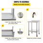Eenvoudige montagestappen voor de VEVOR roestvrijstalen voorbereidingstafel: kolommen, onderblad en wielen.