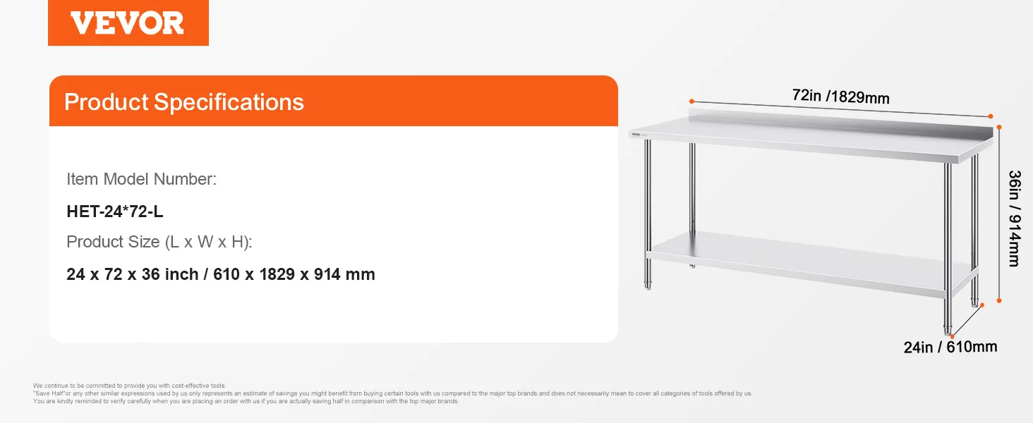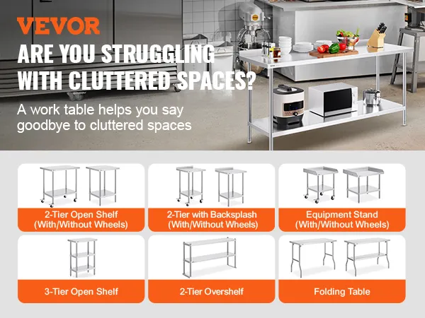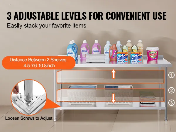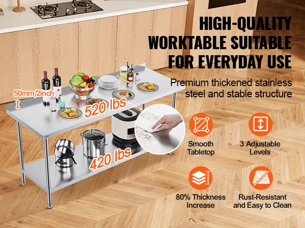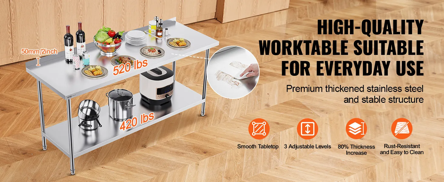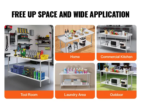 De VEVOR werktafel is heavy-duty. De poten zijn sterk en stevig. Dit zorgt ervoor dat de tafel zware voorwerpen kan dragen. Roestvrij staal voor de poten verbetert de duurzaamheid van de tafel. Bovendien blijft de tafel stabiel, zelfs met zware lasten. Dus, het is betrouwbaar voor verschillende taken. Sterke poten bieden een solide basis voor uw werk. Het maakt niet uit of u werkt aan voedselbereiding of opslag, deze tafel blijft stabiel. U hebt deze duurzaamheid nodig in drukke werkomgevingen. Deze sterke poten dienen als herinnering aan een groot voordeel: de sterkte van de tafel.