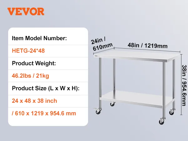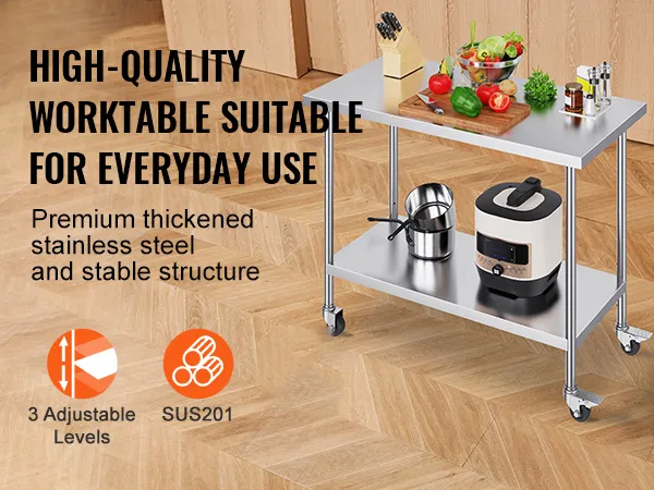 High-Quality Stainless Steel: This work table, measuring 24 x 48 x 38 inch, is made from SUS201 stainless steel for the tabletop, shelves, and legs. It offers superior rust resistance, a sleek appearance, and a smooth surface that is easy to clean with a simple wipe.