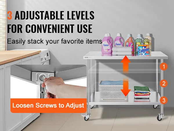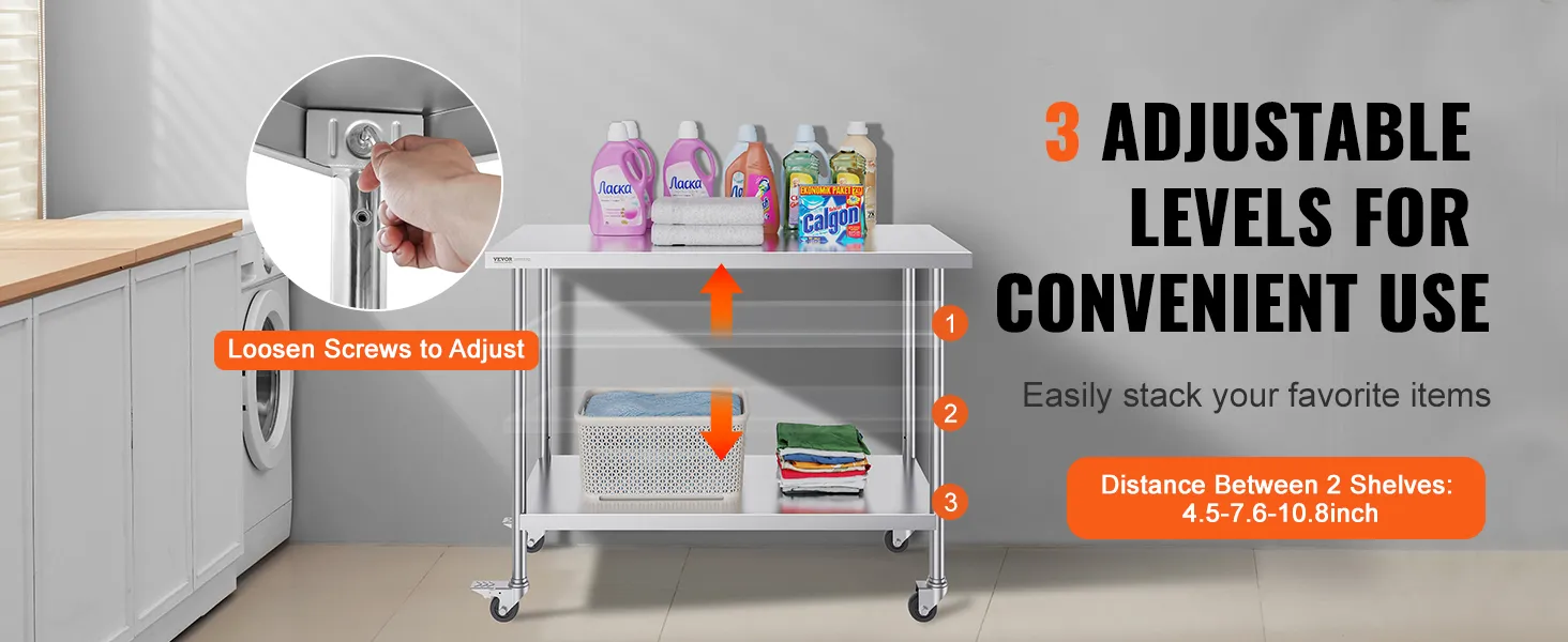 VEVOR Stainless Steel Work Table 24 x 48 x 38 Inch, with 4 Wheels, 3 Adjustable Height Levels, Heavy Duty Food Prep Worktable for Commercial Kitchen Restaurant, Silver