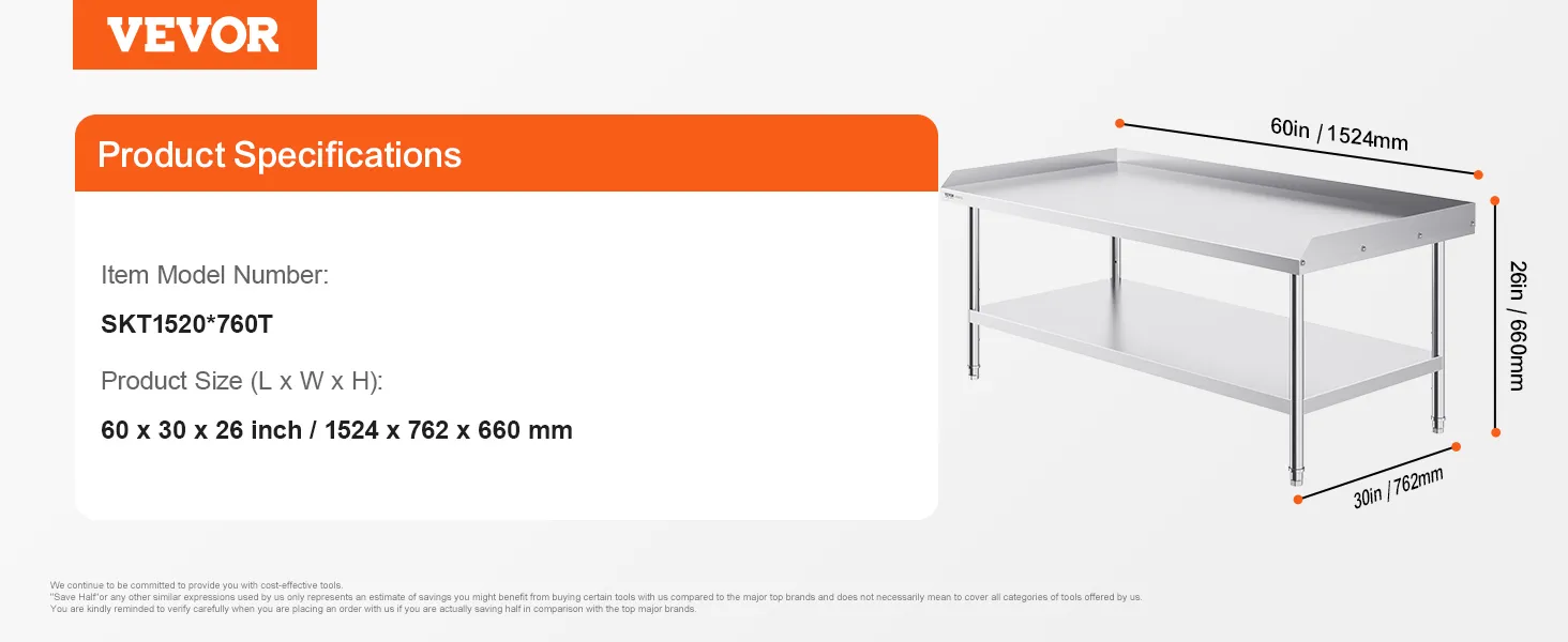 High-Quality Stainless Steel: This work table, measuring 30 x 60 x 26 inch, is made from SUS201 stainless steel for the tabletop, shelves, and legs. It offers superior rust resistance, a sleek appearance, and a smooth surface that is easy to clean with a simple wipe. It meets strict public health standards, ensuring long-lasting protection for your health.