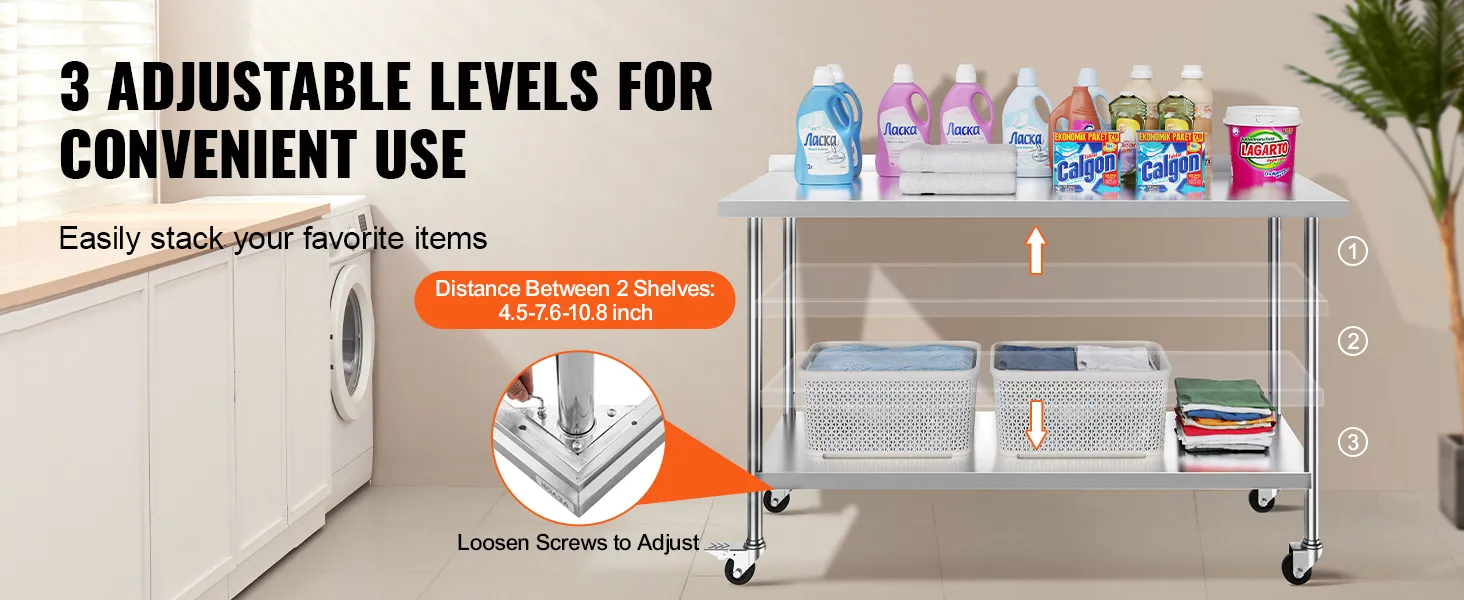User-Friendly Design: Featuring 3-level adjustable shelves, this work table offers the most user-friendly and practical functionality. Simply adjust the shelf height with screws to accommodate items of different sizes. Equipped with 4 swivel casters, including 2 with brakes, the table remains stable and can be easily moved to any location. The high rear backsplash prevents items from falling off and guards against water splashes.