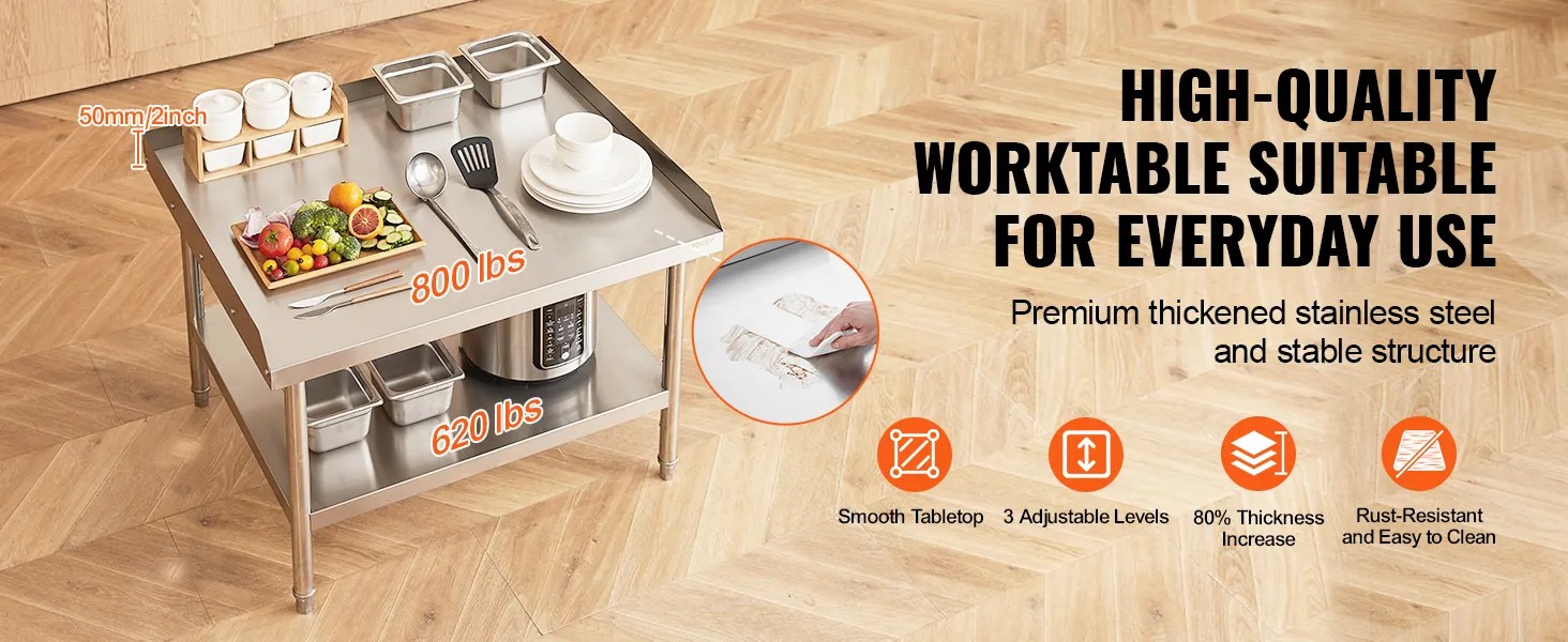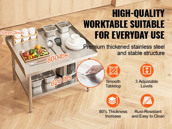Hoogwaardig roestvrij staal: deze werktafel van 762 x 914 x 660 mm (30 x 36 x 26 inch) is gemaakt van SUS201 roestvrij staal voor het tafelblad, de planken en de poten. Het biedt uitstekende roestbestendigheid, een elegante uitstraling en een glad oppervlak dat gemakkelijk schoon te maken is met een doekje. Het is NSF-gecertificeerd, voldoet aan strenge gezondheidsnormen en zorgt voor een langdurige bescherming van uw gezondheid.