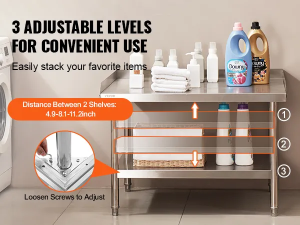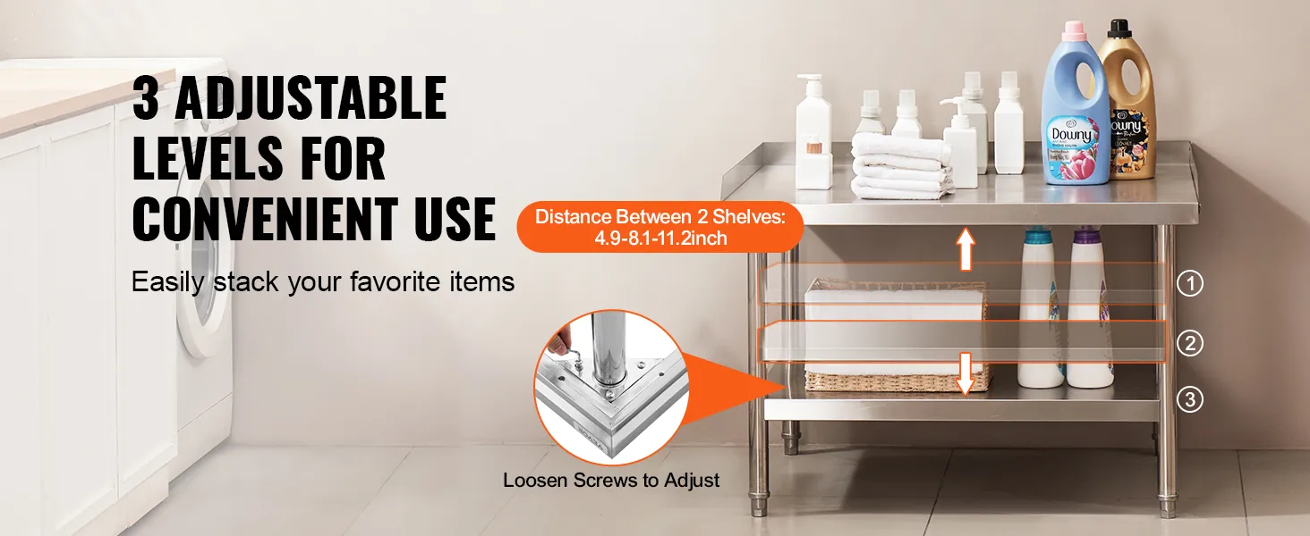 Gebruiksvriendelijk ontwerp: met zijn op drie niveaus verstelbare planken biedt deze werktafel de meest gebruiksvriendelijke en praktische functionaliteit. De hoogte van de planken kan eenvoudig worden aangepast met schroeven, zodat er spullen van verschillende afmetingen in passen. Het 2 inch achterpaneel voorkomt dat waardevolle apparatuur en benodigdheden van de tafel glijden en beschermt bovendien tegen opspattend water.