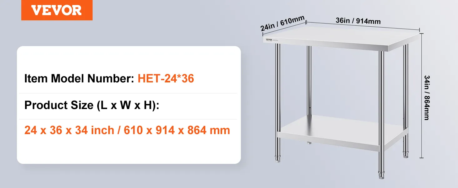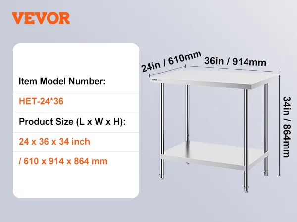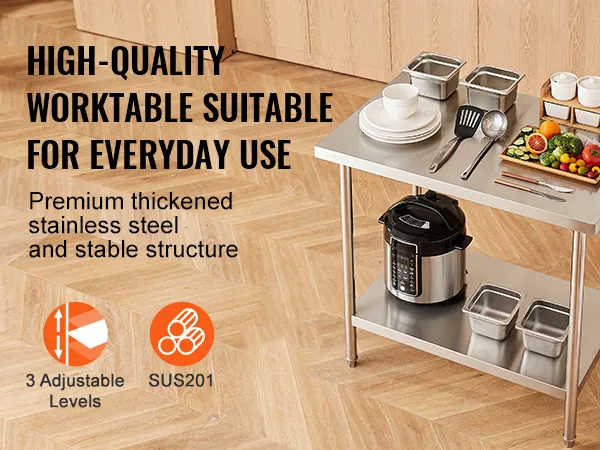 High-Quality Stainless Steel: This work table, measuring 24 x 36 x 34 inch, is made from SUS201 stainless steel for the tabletop, shelves, and legs. It offers superior rust resistance, a sleek appearance, and a smooth surface that is easy to clean with a simple wipe. It meets strict public health standards, ensuring long-lasting protection for your health.