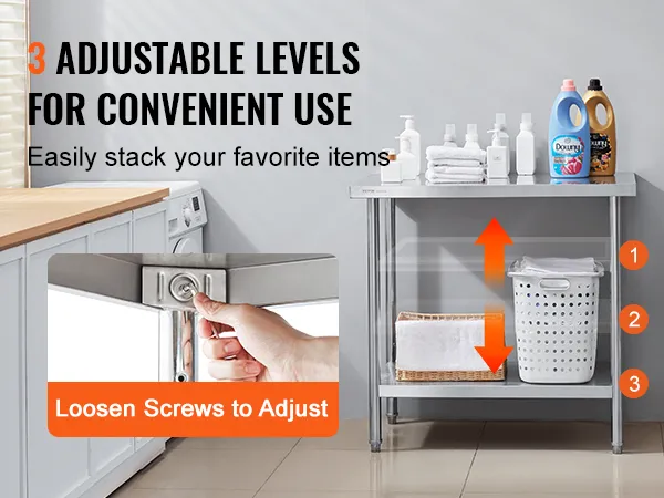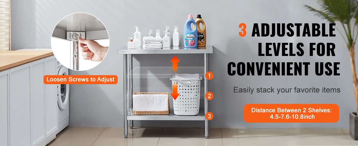 VEVOR Stainless Steel Prep Table, 24 x 36 x 34 Inch, Heavy Duty Metal Worktable with 3 Adjustable Height Levels, Commercial Workstation for Kitchen Garage Restaurant Backyard