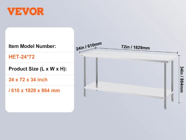 High-Quality Stainless Steel: This work table, measuring 24 x 72 x 34 inch, is made from SUS201 stainless steel for the tabletop, shelves, and legs. It offers superior rust resistance, a sleek appearance, and a smooth surface that is easy to clean with a simple wipe. It meets strict public health standards, ensuring long-lasting protection for your health.