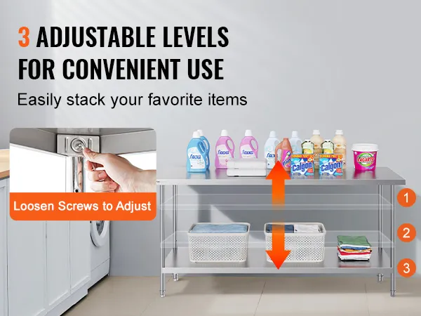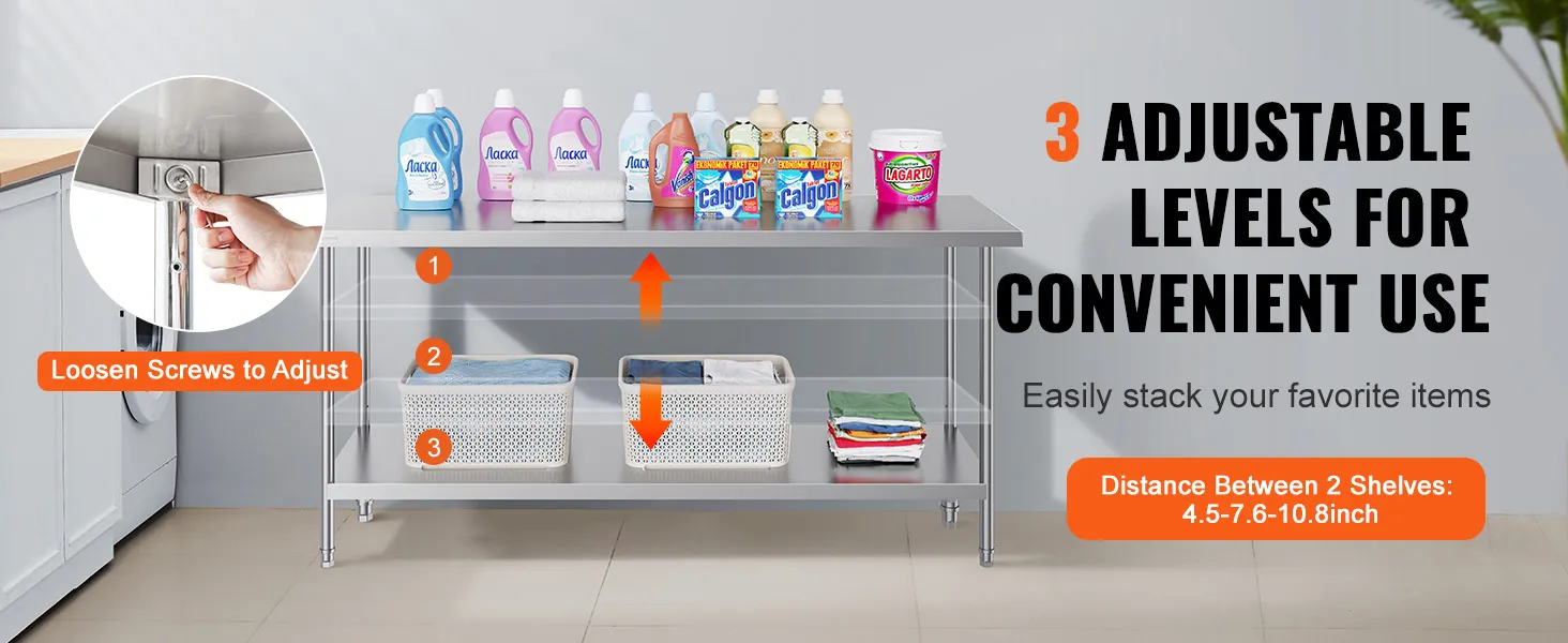 VEVOR Stainless Steel Prep Table, 24 x 72 x 34 Inch, Heavy Duty Metal Worktable with 3 Adjustable Height Levels, Commercial Workstation for Kitchen Garage Restaurant Backyard