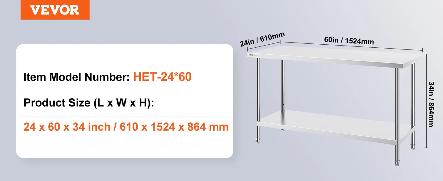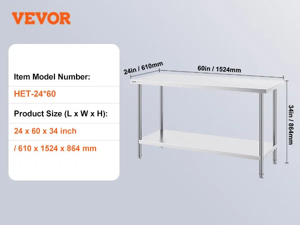 High-Quality Stainless Steel: This work table, measuring 24 x 60 x 34 inch, is made from SUS201 stainless steel for the tabletop, shelves, and legs. It offers superior rust resistance, a sleek appearance, and a smooth surface that is easy to clean with a simple wipe. It meets strict public health standards, ensuring long-lasting protection for your health.