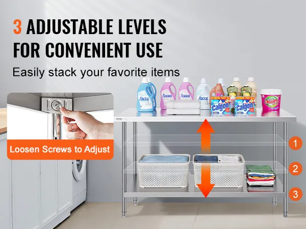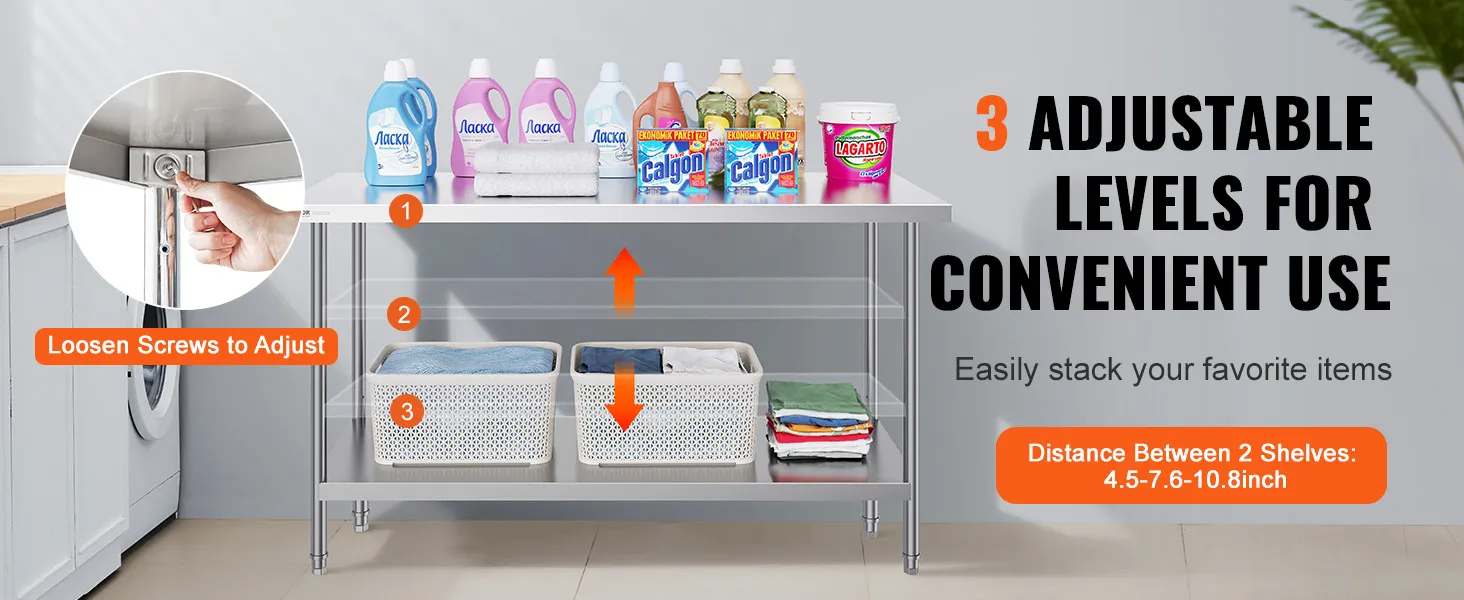 VEVOR Stainless Steel Prep Table, 24 x 60 x 34 Inch, Heavy Duty Metal Worktable with 3 Adjustable Height Levels, Commercial Workstation for Kitchen Garage Restaurant Backyard