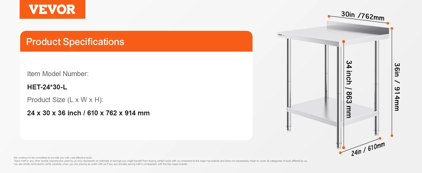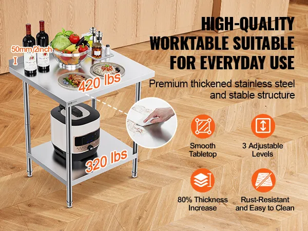 High-Quality Stainless Steel: This work table, measuring 24 x 30 x 36 inch, is made from SUS201 stainless steel for the tabletop, shelves, and legs. It offers superior rust resistance, a sleek appearance, and a smooth surface that is easy to clean with a simple wipe. It meets strict public health standards, ensuring long-lasting protection for your health.