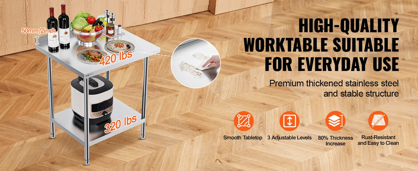 VEVOR 24 x 30 x 36 Inch Stainless Steel Work Table, Commercial Food Prep Worktable Heavy Duty Prep Worktable, Metal Work Table with Adjustable Height for Restaurant, Home and Hotel