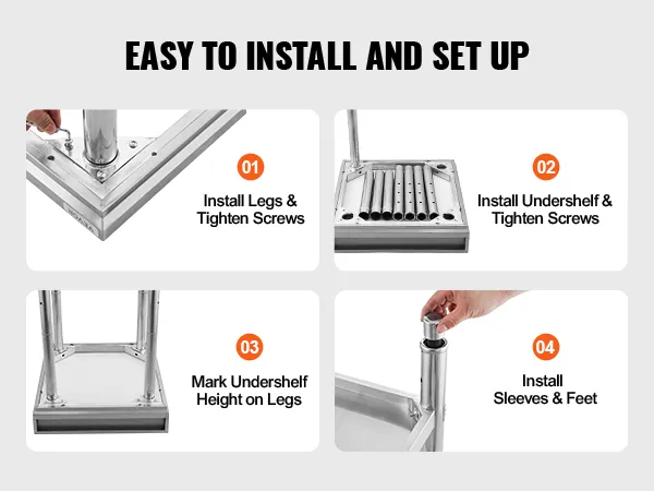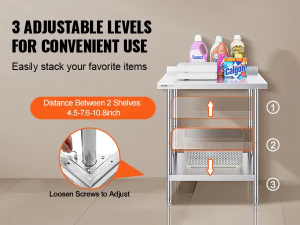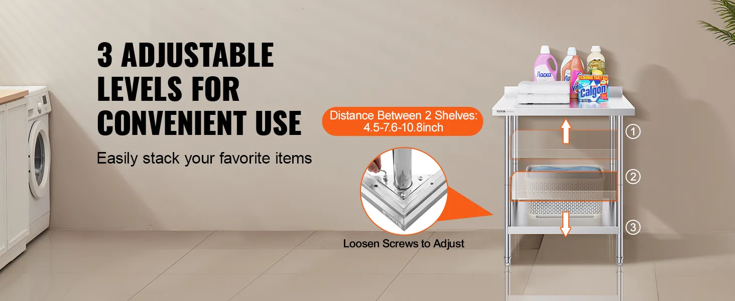 User-Friendly Design: Featuring 3-level adjustable shelves, this work table offers the most user-friendly and practical functionality. Simply adjust the shelf height with screws to accommodate items of different sizes. The high rear backsplash prevents items from falling off and guards against water splashes.