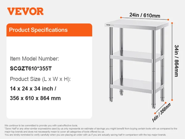 VEVOR Stainless Steel Food Prep Table, 14 x 24 x 34 Inch Commercial Kitchen Worktable, with 2 Adjustable Undershelf, Heavy Duty Prep Table Metal Work Table for BBQ, Kitchen, Home, and Garage