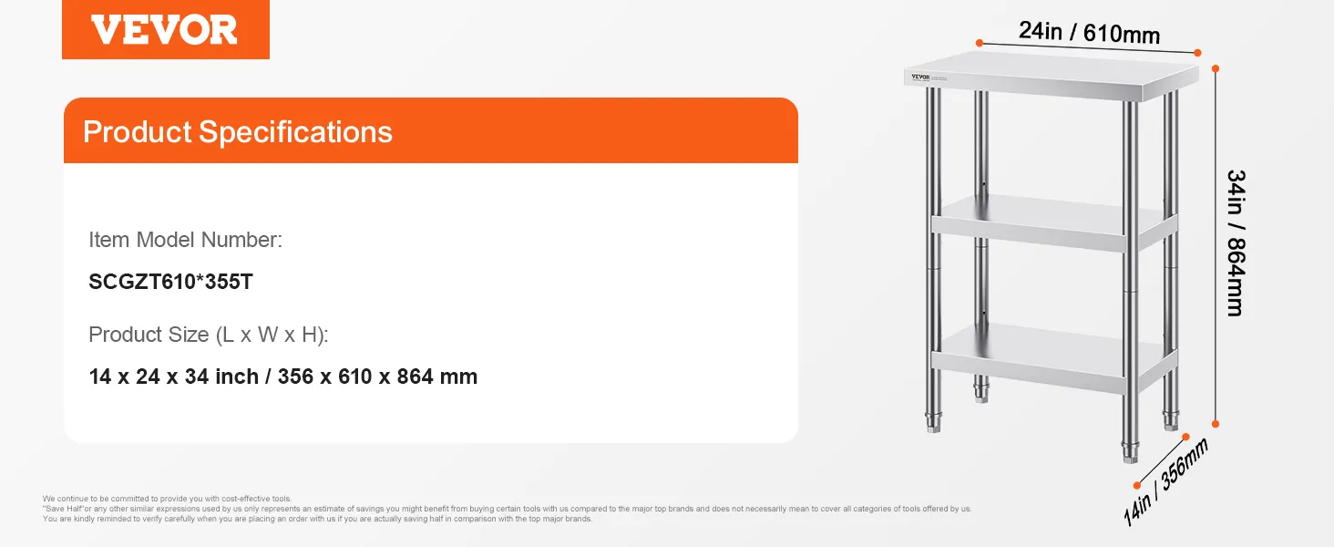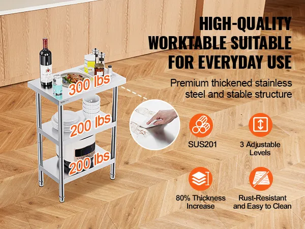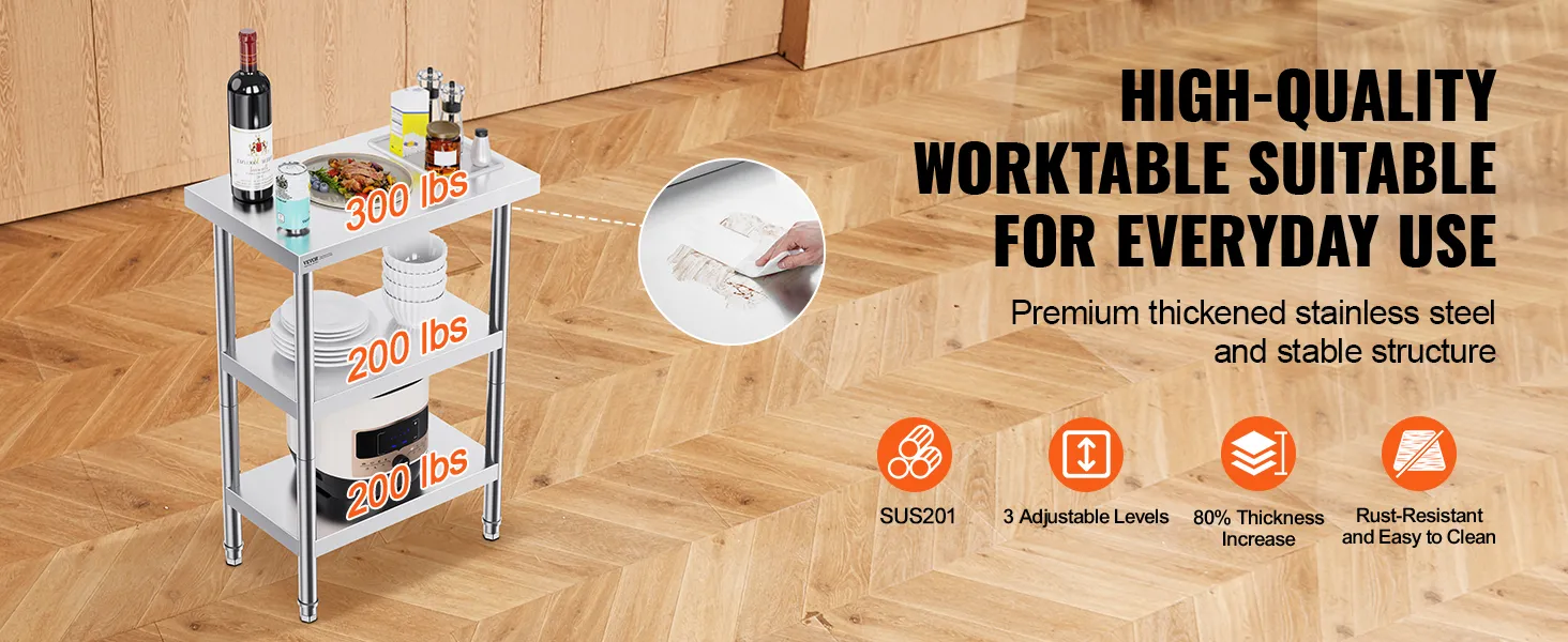High-Quality Stainless Steel: This work table, measuring 14 x 24 x 34 inch, is made from SUS201 stainless steel for the tabletop, shelves, and legs. It offers superior rust resistance, a sleek appearance, and a smooth surface that is easy to clean with a simple wipe. It meets strict public health standards, ensuring long-lasting protection for your health.