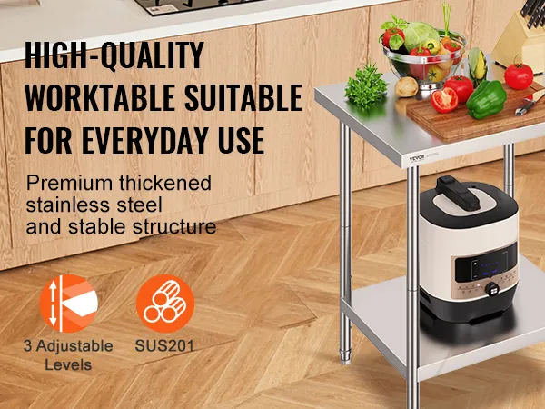 High-Quality Stainless Steel: This work table, measuring 24 x 30 x 34 inch, is made from SUS201 stainless steel for the tabletop, shelves, and legs. It offers superior rust resistance, a sleek appearance, and a smooth surface that is easy to clean with a simple wipe. It meets strict public health standards, ensuring long-lasting protection for your health.