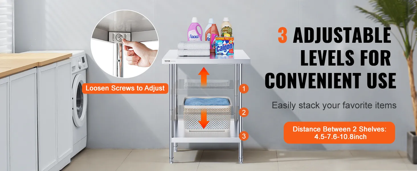 VEVOR Stainless Steel Prep Table, 24 x 30 x 34 Inch, Heavy Duty Metal Worktable with 3 Adjustable Height Levels, Commercial Workstation for Kitchen Garage Restaurant Backyard