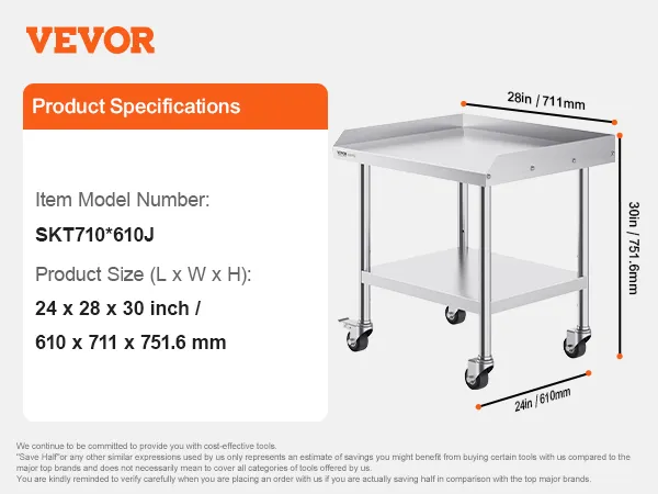 Hoogwaardig roestvrij staal: deze werktafel van 24 x 28 x 30 inch (610 x 711 x 762 mm) is gemaakt van SUS201 roestvrij staal voor het tafelblad, de planken en de poten. Het biedt uitstekende roestbestendigheid, een elegante uitstraling en een glad oppervlak dat gemakkelijk schoon te maken is met een doekje.